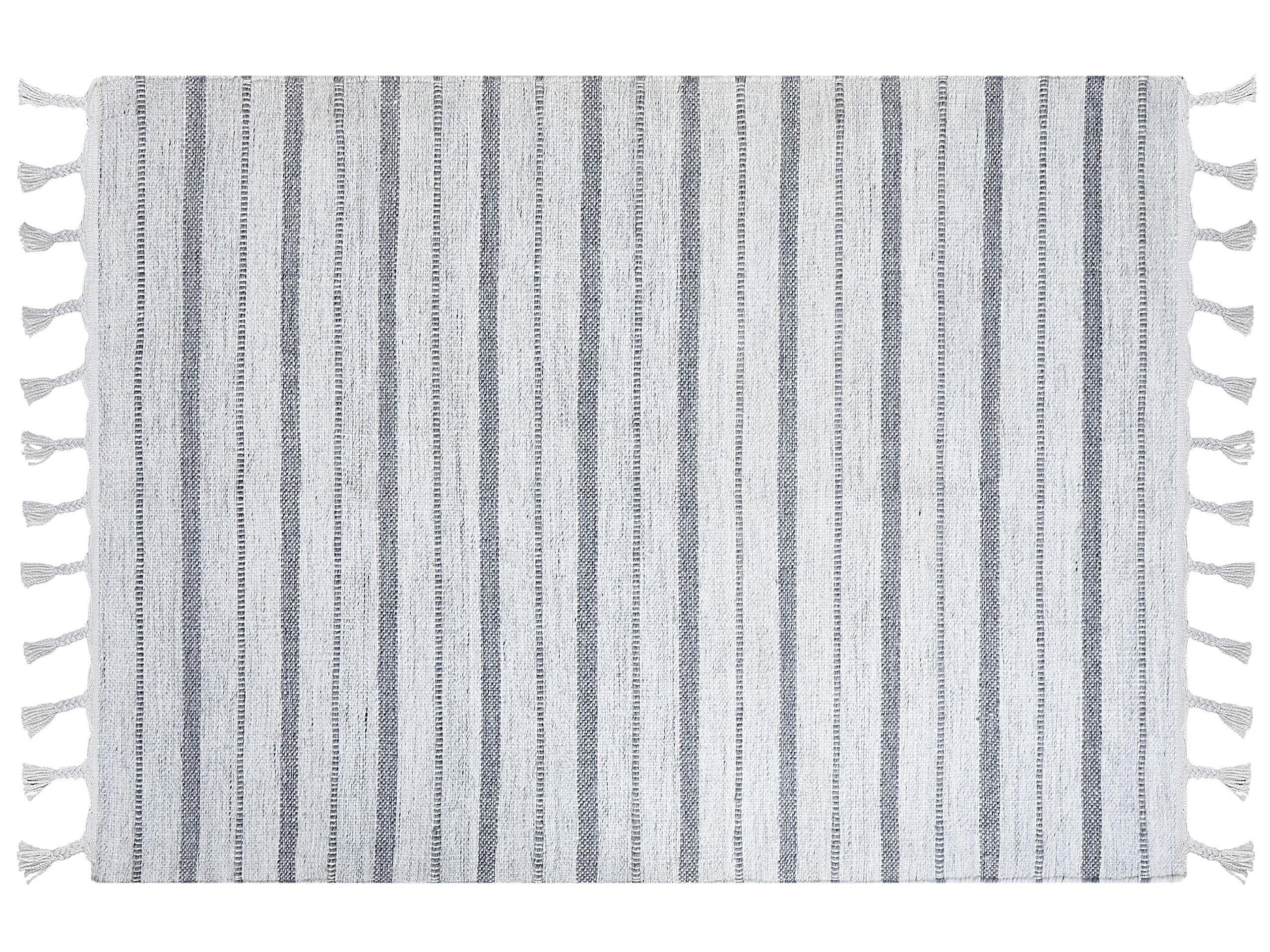 Tapis rayé à pompons. Des couleurs classiques et un design basique font de ce tapis un accessoire universel mais élégant pour tout type d'intérieur. Tissé à la main à partir de matériaux entièrement recyclés, ce tapis est non seulement unique mais aussi écoresponsable. Grâce à la composition du matériau, il peut être utilisé à l'intérieur comme à l'extérieur. Placez-le dans votre salon, sur votre terrasse ou dans un couloir pour profiter de cet accessoire indispensable.