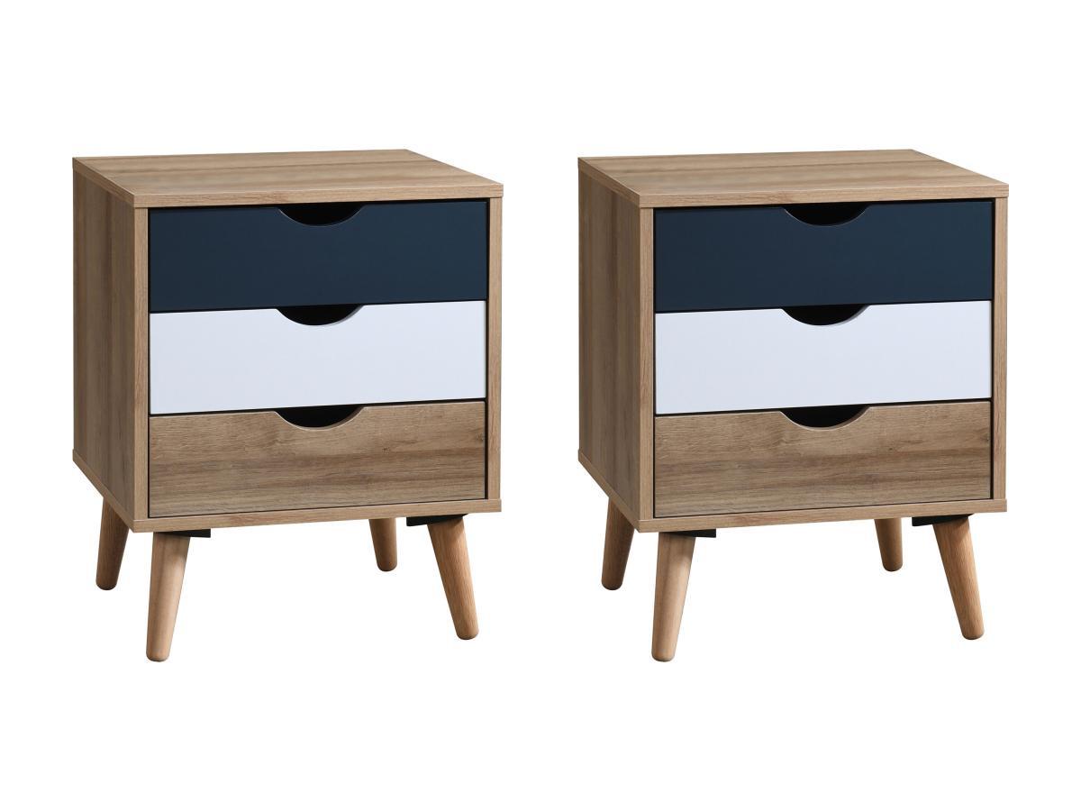 Vente-unique, Lot de 2 tables de chevet avec 3 tiroirs - Coloris : Naturel, blanc et bleu marine - LURVIA