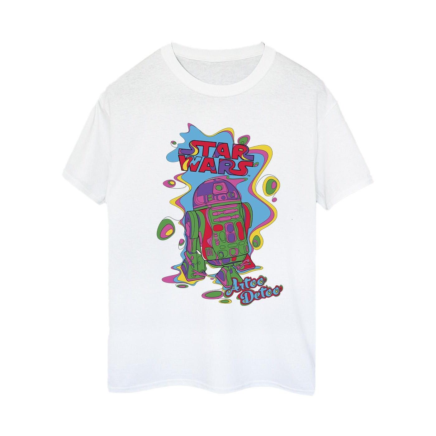 Ce T-shirt présente un graphique vibrant et coloré du droïde emblématique R2-D2. Le design inclut le logo "Star Wars" et le texte "Artoo Detoo", le tout rendu dans un style ludique et dégoulinant avec des teintes vives. Ce T-shirt est une façon amusante et élégante de montrer son appréciation pour le personnage bien-aimé et l'univers Star Wars.