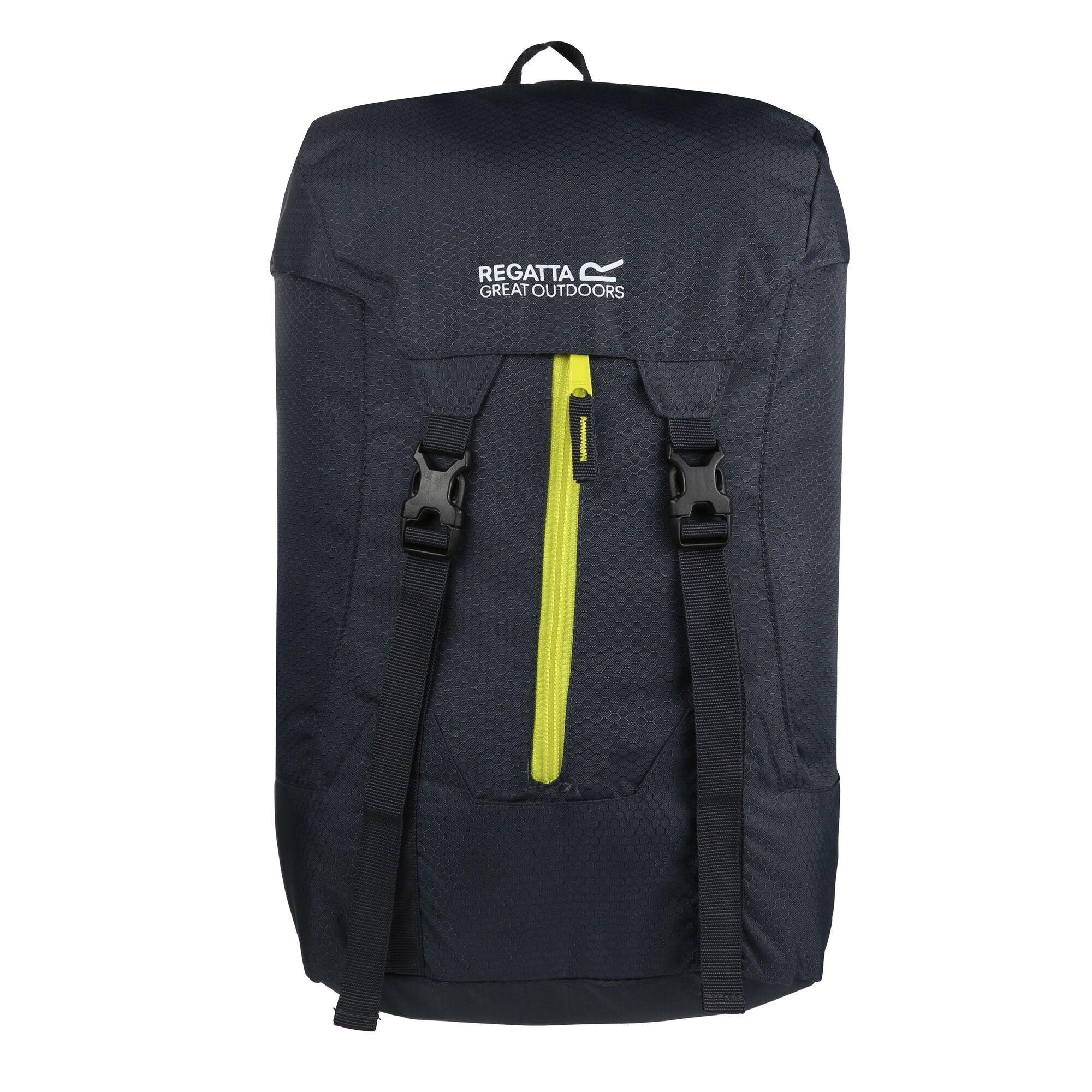Léger. Bretelles ajustables en tissu maillé. Poignée sur le dessus. Fermeture avec 2 clips en plastique. Se replie dans la poche avant. Capacité: 25 litres. Dimensions approx.: 44,5 cm x 31,5 cm x 19,5 cm (plié: 20 cm x 9 cm x 9 cm). Composition: 100% polyester.