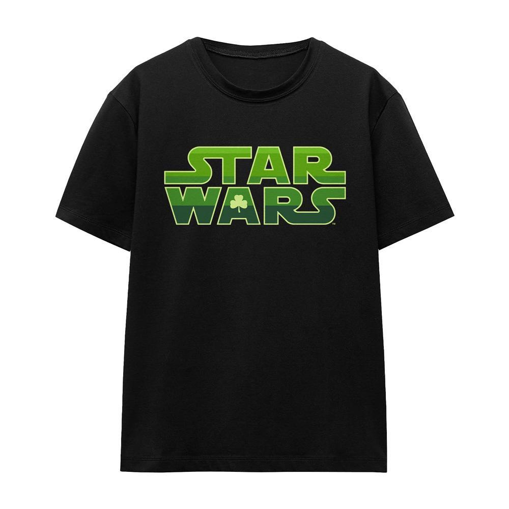Ce T-shirt arbore un logo Star Wars festif, parfait pour célébrer la Saint-Patrick. Le lettrage emblématique de Star Wars est rendu dans des tons de vert, avec un trèfle remplaçant le 'A' de 'Wars', ajoutant une touche unique au design.