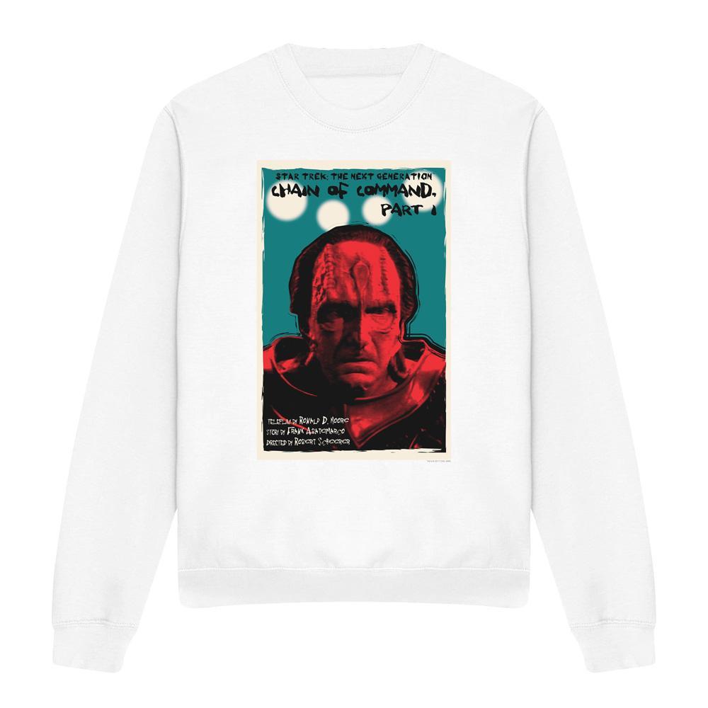 Ce sweatshirt présente un imprimé graphique inspiré de "Star Trek: The Next Generation" Saison 6 Épisode 10, "Chaîne de Commandement, Partie I". Le design met en valeur un personnage proéminent de l'épisode, en faisant une pièce distinctive pour les fans.