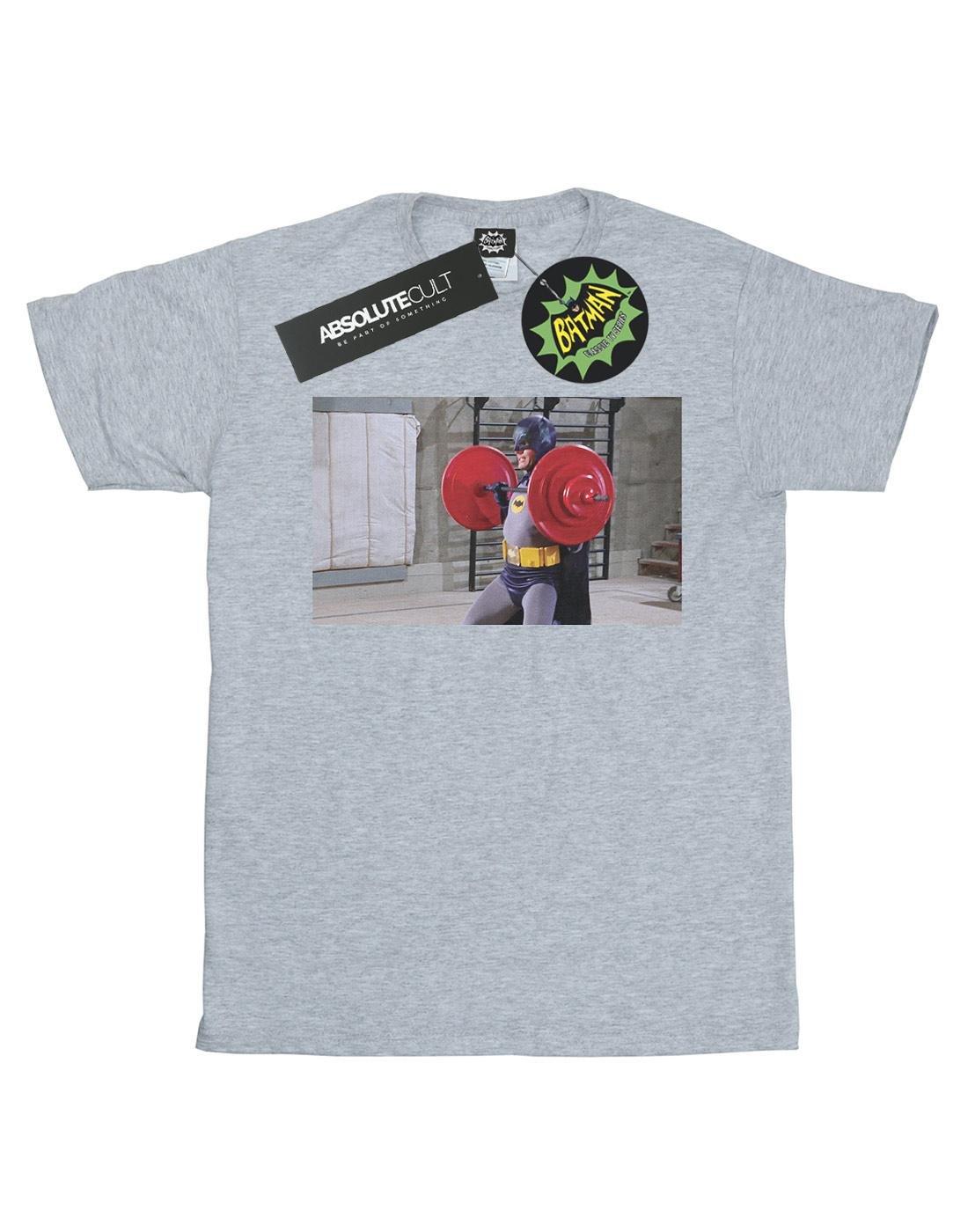 Ce T-shirt présente un col rond classique, des manches courtes et une coupe régulière. Il arbore un graphique amusant de Batman de la série télévisée classique soulevant des poids, ce qui en fait un excellent ajout pour les fans du Caped Crusader.