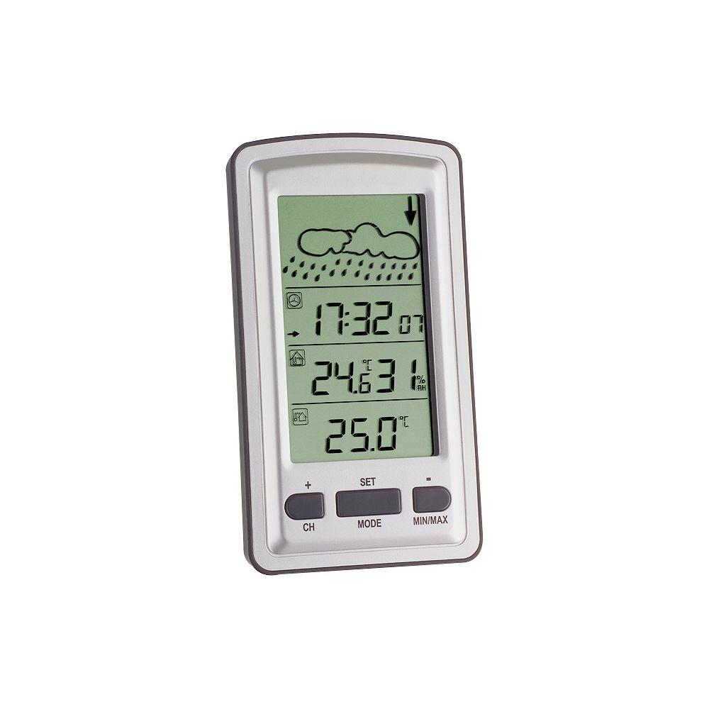 Température extérieure via émetteur sans fil, portée 100 m maximum (champ libre), extensible jusqu'à 3 émetteurs, également pour le contrôle de la température de pièces éloignées telles que chambres d'enfants, caves à vin, etc., température et humidité intérieures, valeurs maximales et minimales, météo prévisions avec symboles et tendance de la pression atmosphérique, Radio-réveil avec alarme et affichage de la date, rétroéclairage, installation facile, car aucun câble n'est requis, piles non incluses, vous avez besoin de 2xAA 1,5 V et 2xAAA 1,5 V, température extérieure -40 °C à + 65 ° C, température intérieure -10 ° C jusqu'à + 80 ° C, 20-99% humidité