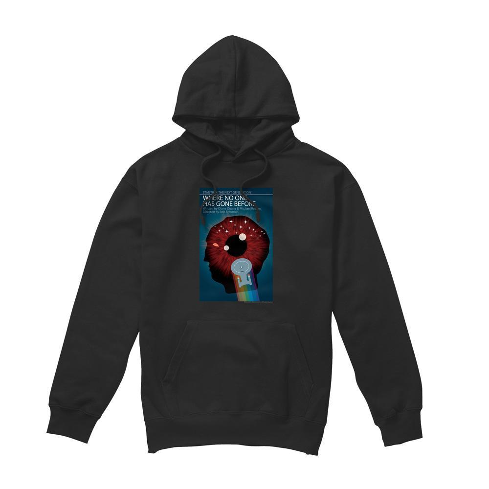 Ce sweat à capuche présente un imprimé graphique inspiré de « Star Trek: The Next Generation Saison 1 Épisode 6 ». Le design met en valeur une tête stylisée avec des éléments cosmiques et une clé, capturant l'essence du thème de l'épisode. C'est un choix confortable et élégant pour les fans.