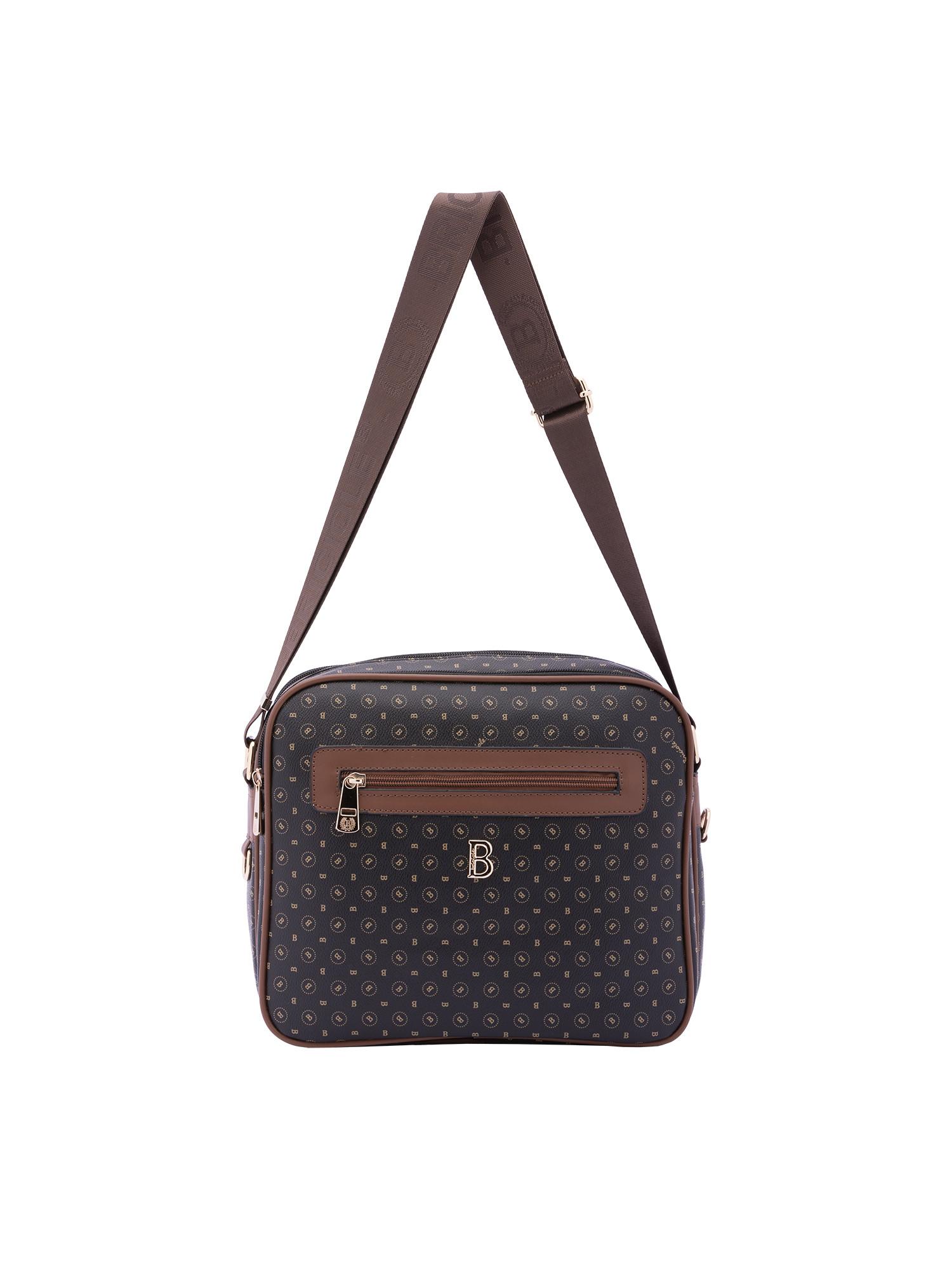 Ce sac à bandoulière arbore un motif intégral distinctif et un logo 'B' proéminent sur le devant, ajoutant une touche de sophistication à toute tenue. Le sac est conçu pour être pratique, offrant amplement d'espace pour les essentiels quotidiens.