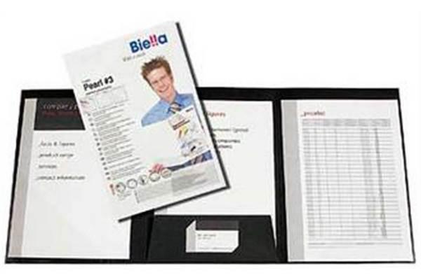 PEARL #3 - Präsentationsmappe A4 Mit der 3-teiligen Präsentationsmappe Pearl #3 von Biella ist ein professioneller Auftritt garantiert. 2 Dreieckstaschen halten Ihre Unterlagen fest. Die Klappe im Mittelteil bewahrt die Unterlagen vom Herausfallen und bietet Platz zum Einlegen Ihrer Visitenkarte. Die Sichttasche auf dem Vorderdeckel dient zur Einlage eines individuell gestalteten Deckblattes. Ideal für Präsentation und Dokumentationen. Vorderdeckel mit transparenter Sichttasche passend in C4 Couvert Oben offen Material: laminierter Karton (240g/qm) 2 Innenklappen und Einsteckschlitzen für Visitenkarten
