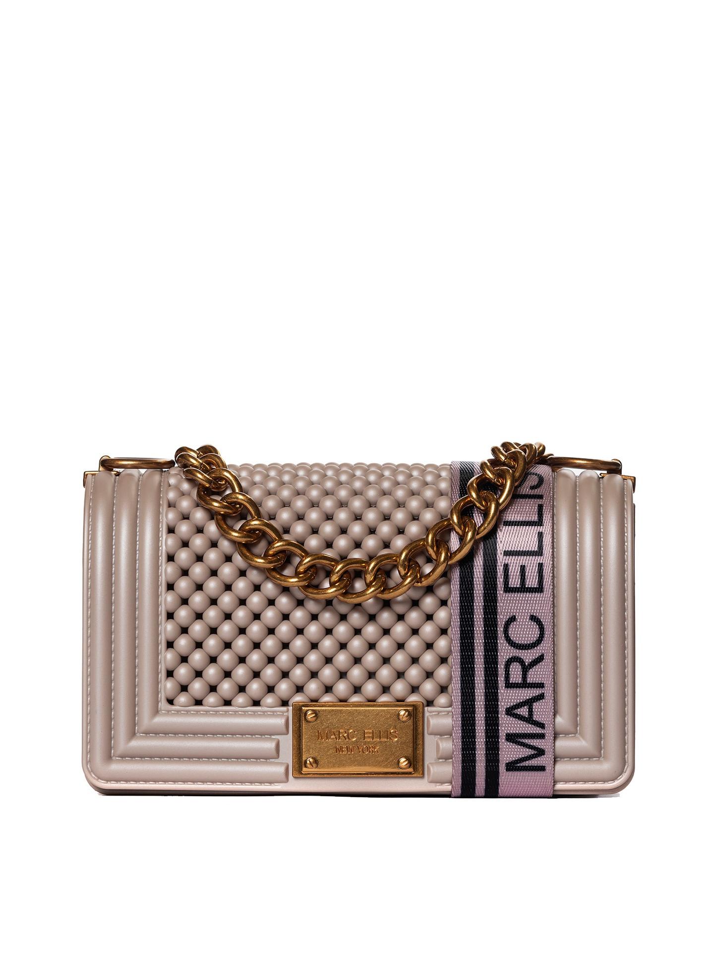 Ce sac à bandoulière présente un design perlé distinctif sur le rabat avant, complété par une bandoulière chaîne dorée et une bandoulière textile griffée. Sa silhouette structurée et ses détails élégants en font un accessoire polyvalent pour diverses occasions.