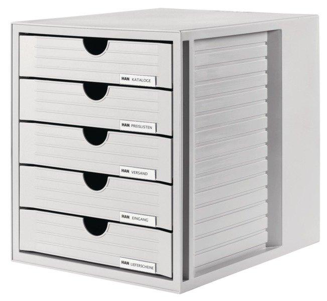 Module de classement à 5 tiroirs avec clips de marquage (réf. 1021) pour le papier au format A4 et supérieur. Design attrayant et innovant de haute qualité. Tiroirs à coulissage facile avec arrêt et trou de préhension, pour une prise confortable. Sa hauteur et sa profondeur extérieures sont adaptées à la taille des dossiers ou à un espace de rangement pour dossier, donc idéal pour l'armoire. Conception très résistante Empilable, donc peu encombrant. Les pieds en caoutchouc antidérapants n'abîment pas la surface des meubles et assurent une bonne stabilité.
