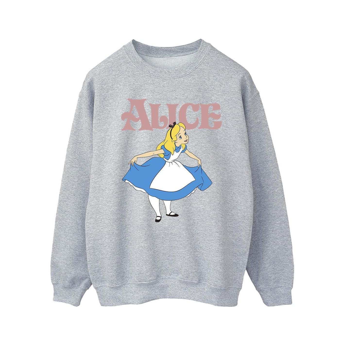 Ce sweatshirt présente un charmant graphique d'Alice d'Alice au Pays des Merveilles faisant la révérence, avec le nom "ALICE" imprimé au-dessus. Il offre une coupe régulière confortable, le rendant adapté à diverses occasions décontractées.
