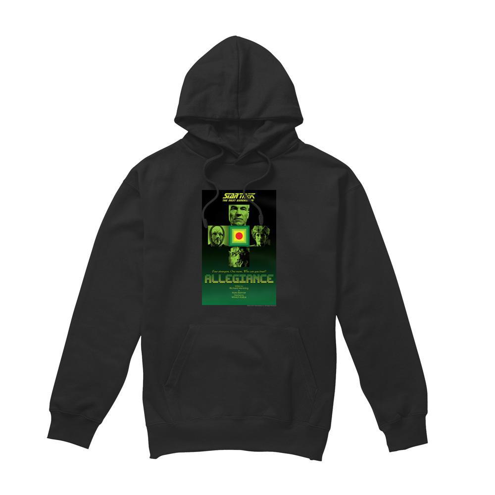 Ce sweat à capuche présente un imprimé graphique inspiré de l'épisode 18 de la saison 3 de "Star Trek: The Next Generation", intitulé "Allegiance". Le design met en valeur les personnages clés de l'épisode, en faisant une pièce distinctive pour les fans.