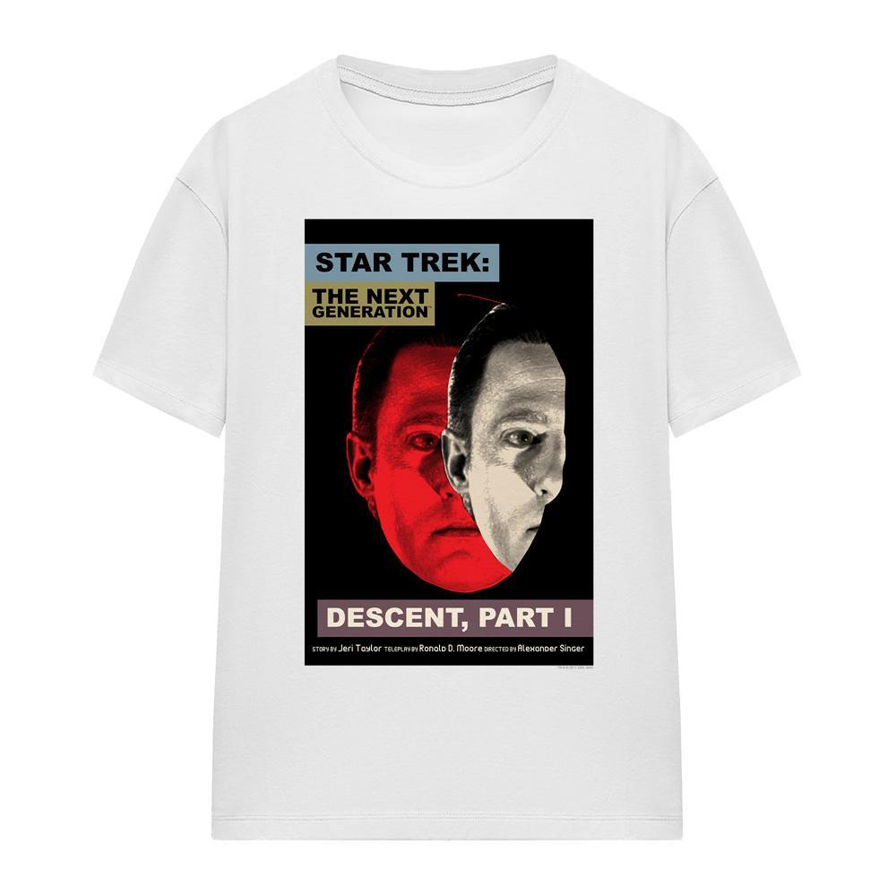 Ce T-shirt présente un imprimé graphique inspiré de "Star Trek: The Next Generation" Saison 6, Épisode 26, intitulé "Descent, Part I". Le design capture l'essence de la série de science-fiction emblématique, en faisant un ajout distinctif à la garde-robe de tout fan.