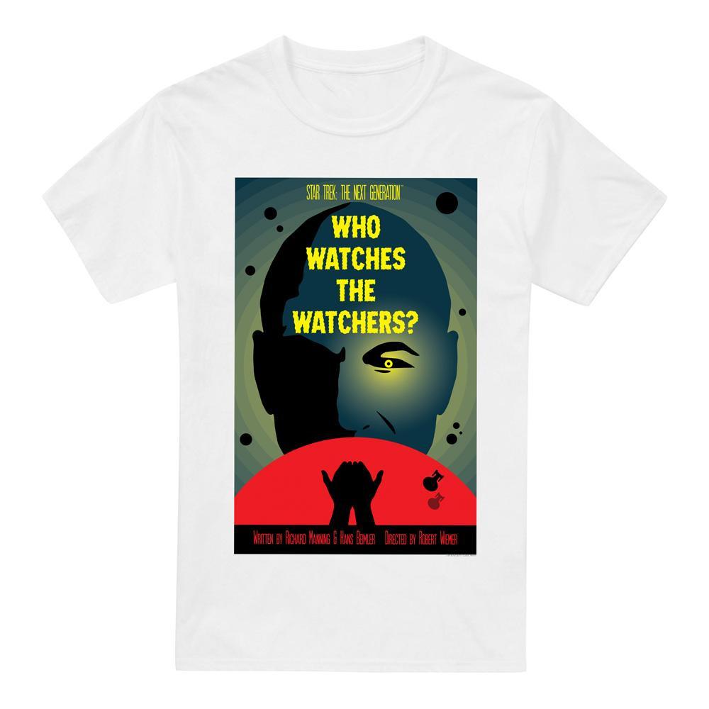 Ce T-shirt présente un imprimé graphique inspiré de « Qui surveille les surveillants ? », saison 3 épisode 4 de Star Trek : The Next Generation. Le design capture l'essence de l'épisode avec une représentation stylisée de la tête et des mains d'un personnage, sur un fond cosmique.
