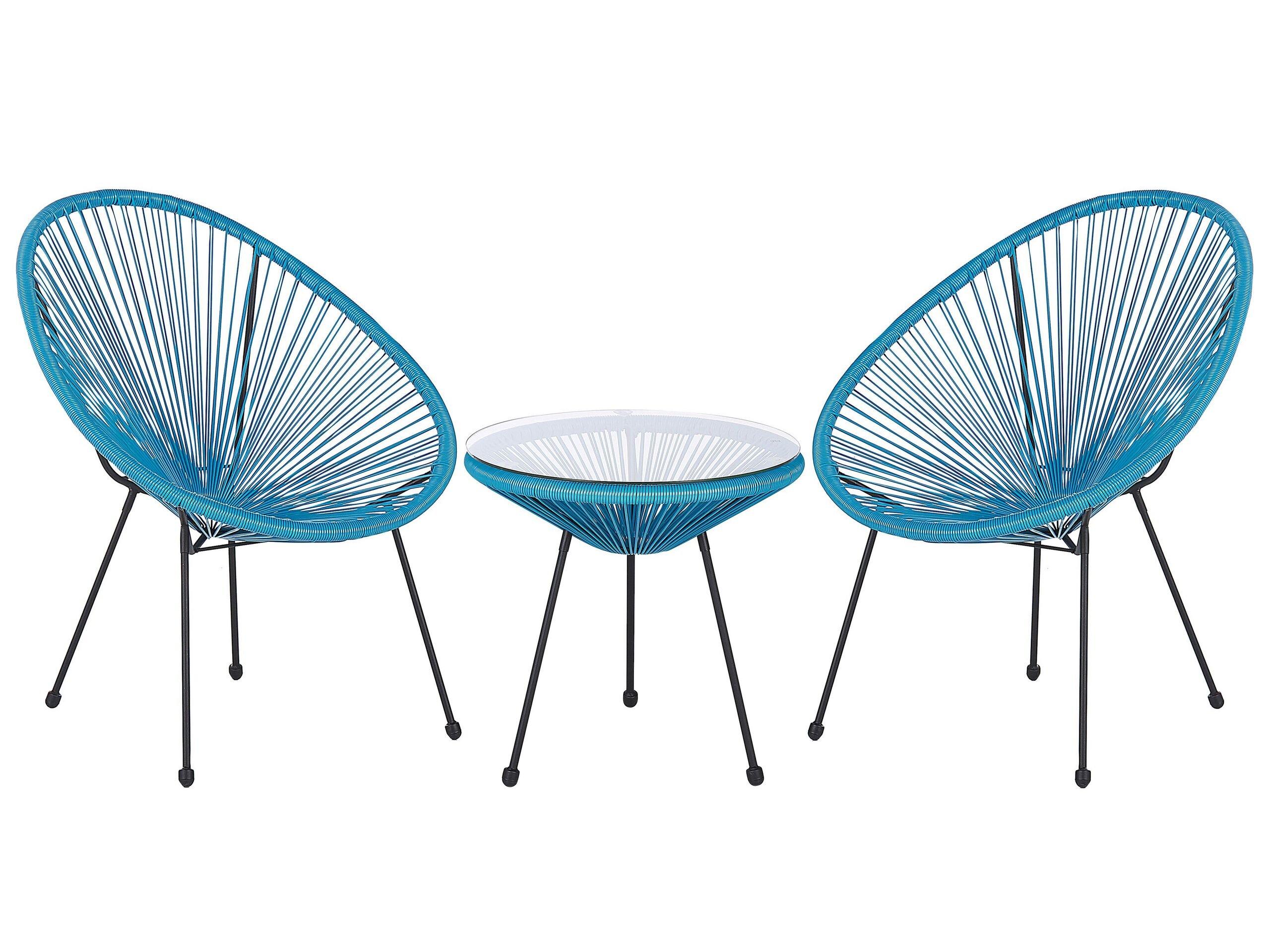 Set de 2 fauteuils design oeuf en rotin bleu avec table assortie. Cet ensemble de 2 chaises design et d'une table basse inspirées du style mexicain emblématique ravivera tout espace de vie intérieur ou extérieur. L'assise des chaises, en cordes de polyrotin, assure un confort incomparable, tandis que le piétement en acier noir est une garantie de stabilité et durabilité. Ce petit salon de type bistrot sera idéal aussi bien pour compléter le décor de votre jardin que celui de votre séjour.