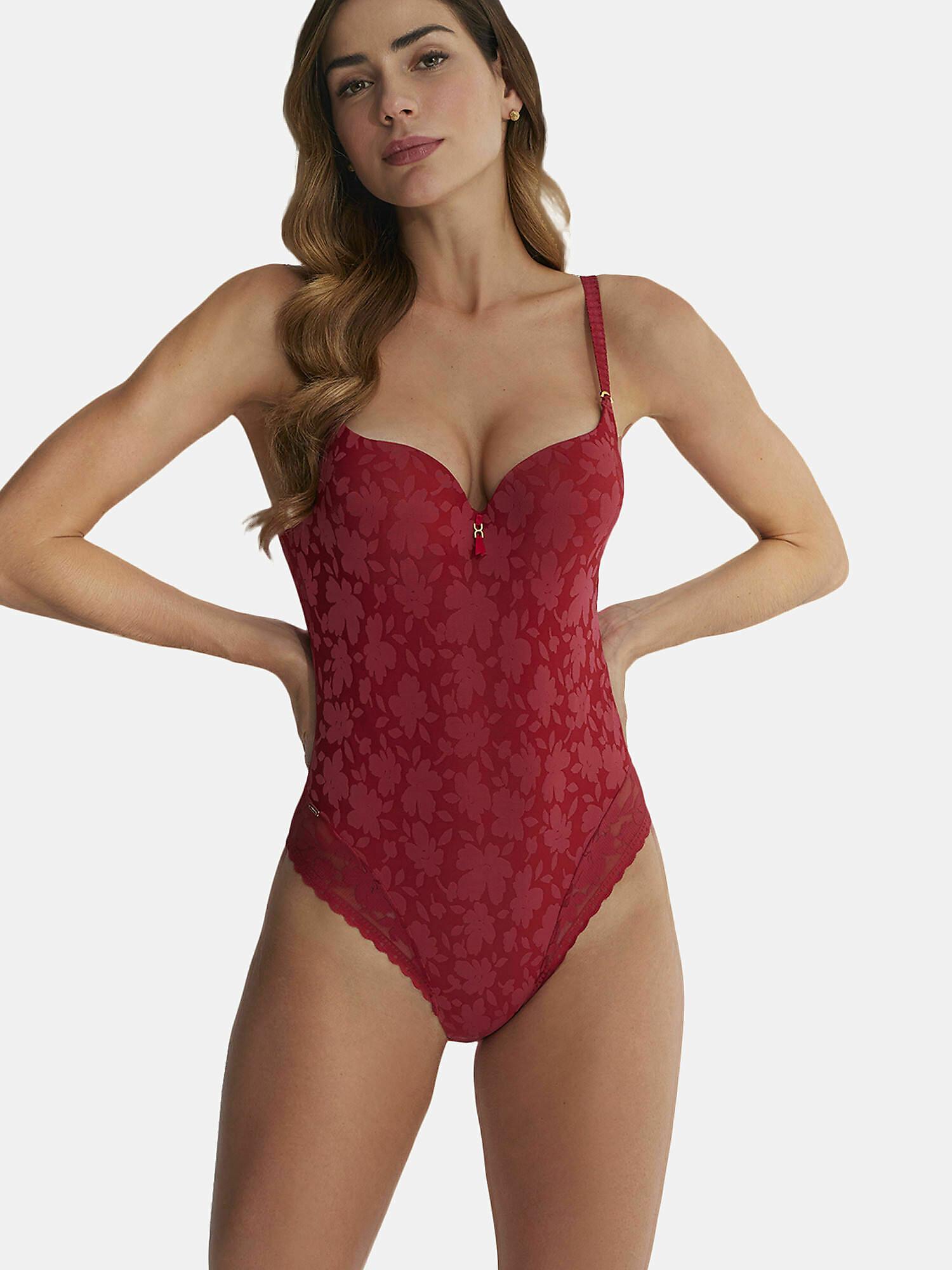 Ce body préformé armaturé de la collection Gabrielle offre une silhouette flatteuse avec son design élégant et sa structure de soutien. Le body confort est doté d'une coupe slip à l'arrière, assurant qu'il reste invisible sous les vêtements pour un look parfait. De délicats détails en dentelle et un joli petit bijou entre les bonnets ajoutent une touche romantique. L'avant est doublé de tulle pour un effet légèrement gainant, moulant le corps et recentrant la poitrine. Les fines bretelles sont réglables pour un ajustement parfait, et une fermeture à agrafes est située à l'entrejambe. Un petit logo doré est placé sur le côté de la hanche, et un gousset en coton assure un confort intime garanti. Ce vêtement promet des moments privilégiés, offrant une touche de mystère et de séduction qui transforme le pouvoir de la féminité dans sa forme la plus raffinée et la plus captivante.
