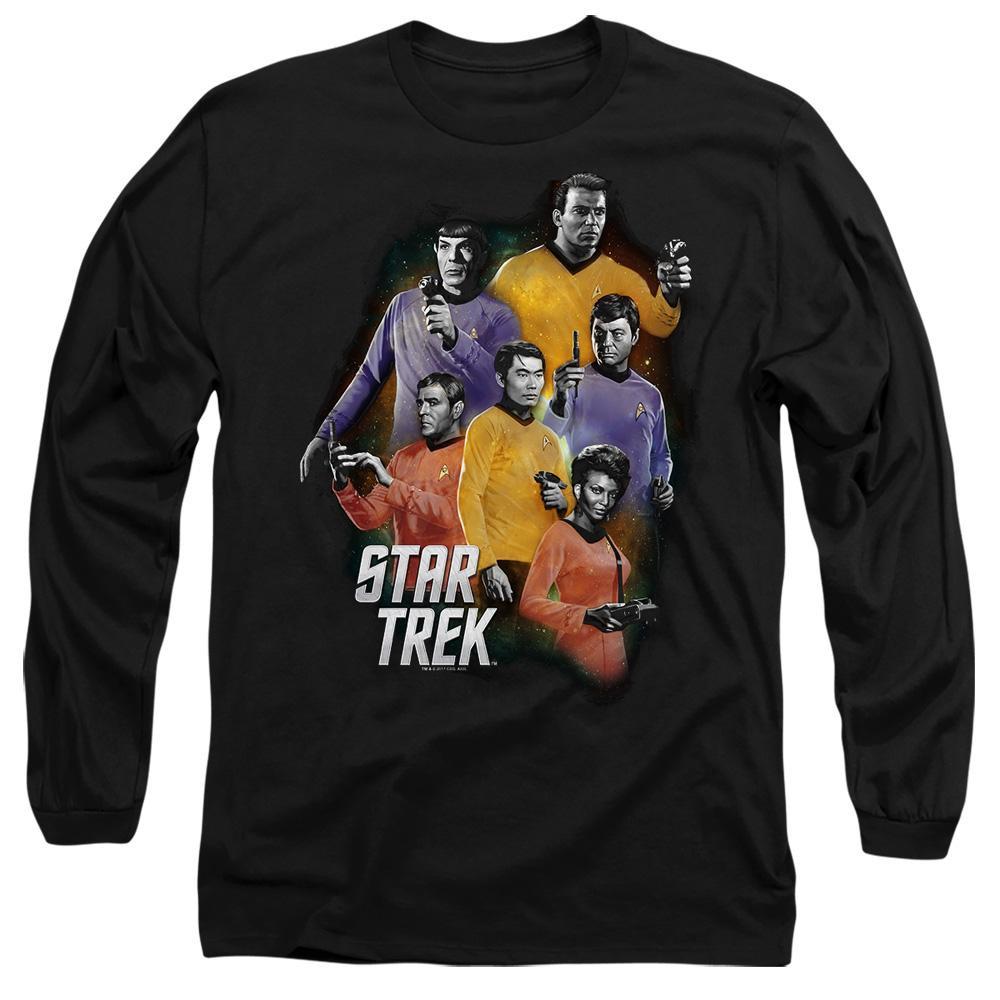 Ce t-shirt à manches longues présente un imprimé graphique de l'équipage original de Star Trek. Le design met en valeur des personnages emblématiques dans leurs uniformes classiques, ce qui en fait un excellent choix pour les fans de la légendaire franchise de science-fiction.