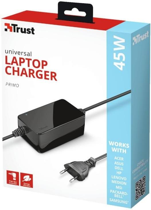 Le chargeur pour ordinateur portable Trust Primo 45 W peut être utilisé avec pratiquement n'importe quel ordinateur portable qui nécessite un adaptateur d'alimentation de 45 W ou de puissance moins élevée. Sélectionnez tout simplement l'un des connecteurs intégrés et rechargez votre ordinateur portable Acer, Asus, Dell, HP, Lenovo, Medion, MSI ou Toshiba. Le connecteur adapté n'est pas inclus dans le kit ? Visitez trust.com/21904 pour demander un connecteur supplémentaire gratuit.