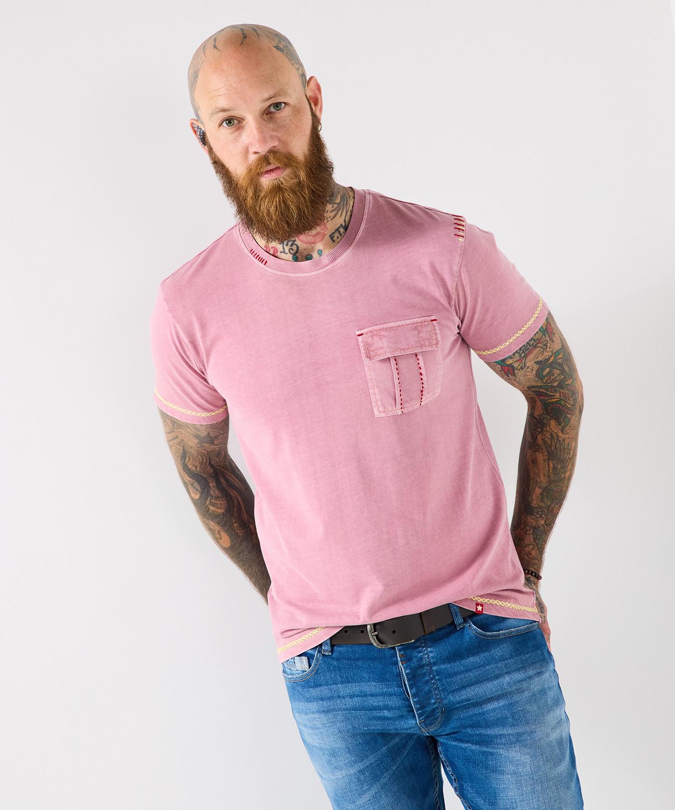 Ce t-shirt rose à col rond, plein de petits détails subtils, égaiera toutes les tenues hivernales. Il offre une option confortable et élégante pour un usage quotidien, avec un col rond classique et des manches courtes, ce qui en fait un ajout polyvalent à toute garde-robe. Le design comprend une poche poitrine unique avec des surpiqûres décoratives qui ajoutent une touche d'individualité.