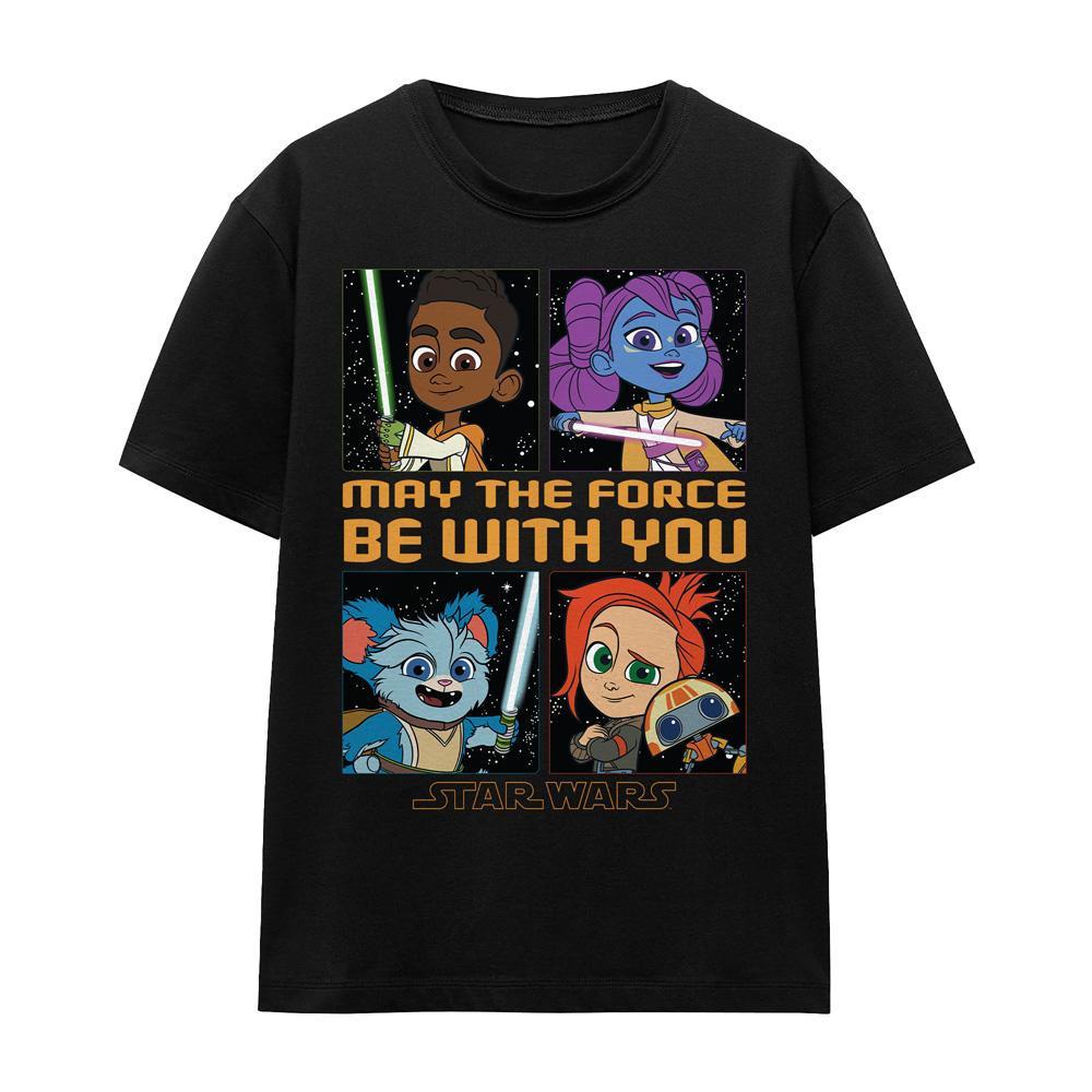 Ce T-shirt présente un imprimé graphique vibrant inspiré de la série Young Jedi Adventures. Le design met en scène quatre personnages animés, chacun tenant un sabre laser, sur un fond étoilé. Sous les personnages, la phrase emblématique « MAY THE FORCE BE WITH YOU » est affichée en évidence, suivie du logo Star Wars.