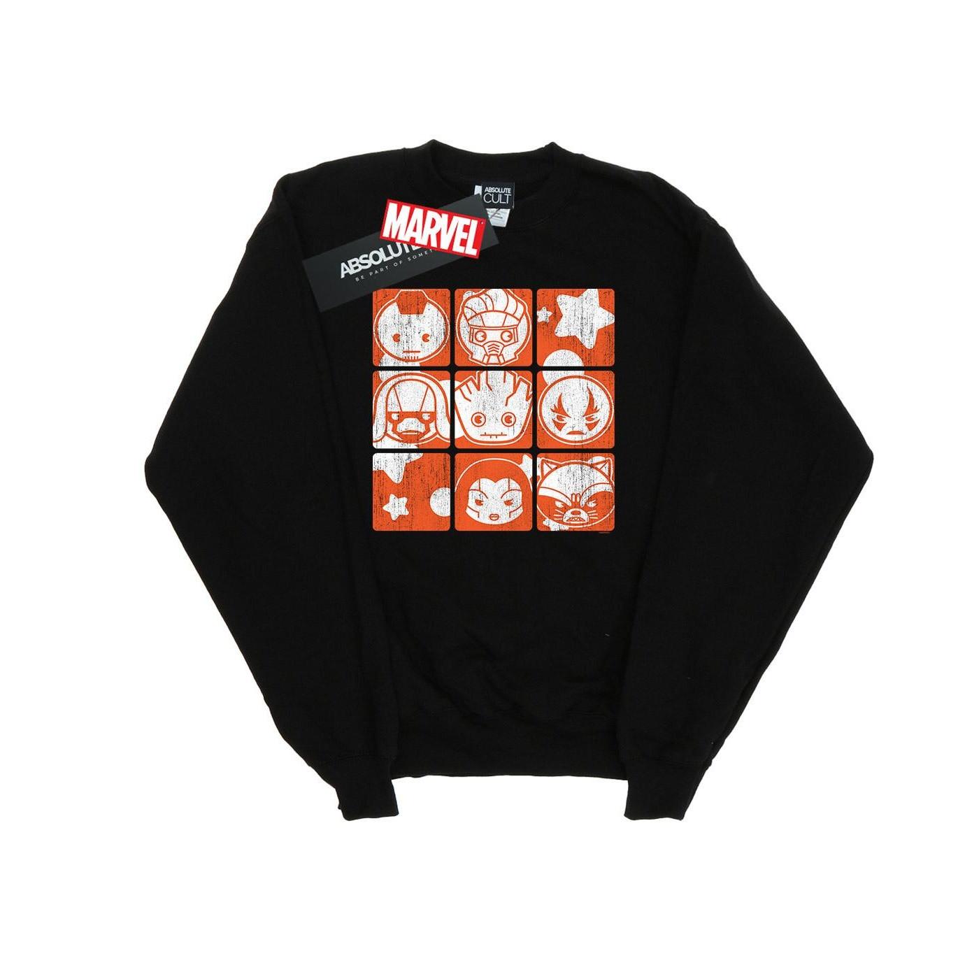 Ce sweatshirt Guardians Of The Galaxy présente un col rond et des manches longues, offrant une coupe confortable et décontractée. Le devant du sweatshirt affiche un imprimé graphique de divers personnages des Guardians of the Galaxy dans un design stylisé en grille carrée.