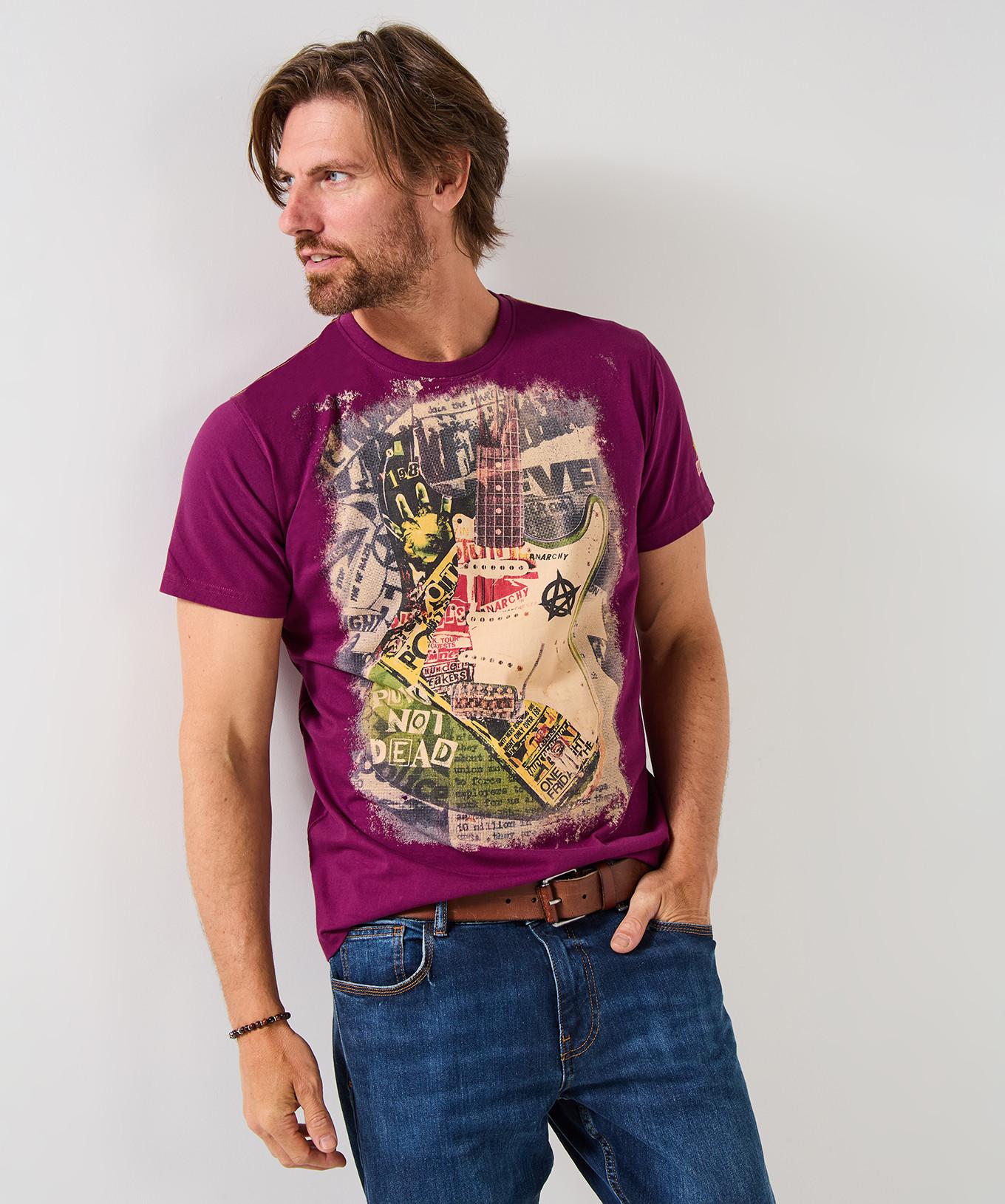 Ce T-shirt présente un imprimé anarchie frappant, ce qui en fait un ajout distinctif à toute garde-robe. Le design intègre un motif de guitare entouré de divers éléments graphiques, créant un look audacieux et expressif.