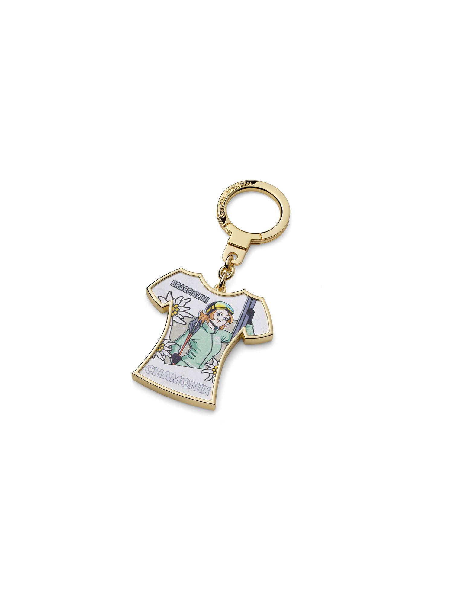 Ce porte-clés Braccialini présente un charmant design en forme de t-shirt, parfait pour ajouter une touche de personnalité aux clés ou aux sacs. Le design met en scène un skieur avec le nom de la marque « BRACCIALINI » et « CHAMONIX » inscrits, évoquant un sentiment d'aventure et de style.