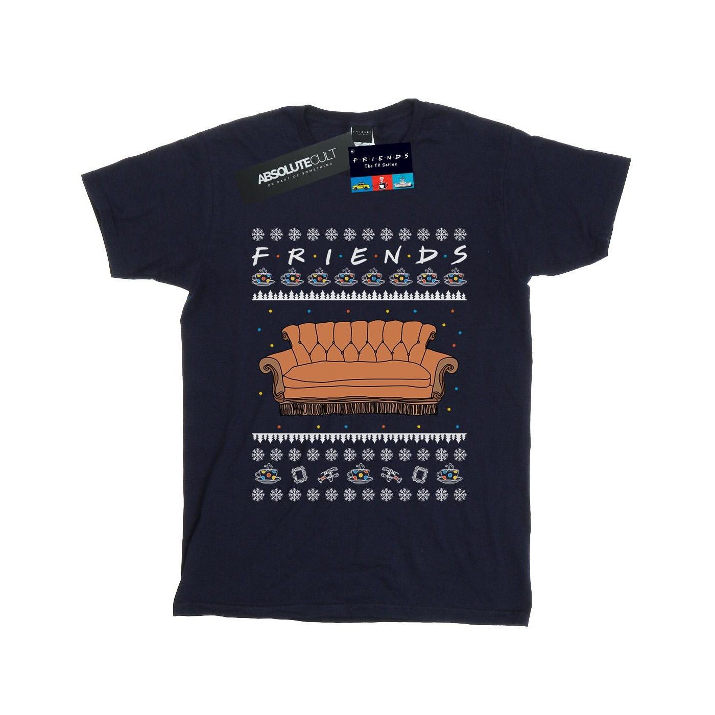 Ce T-shirt présente un design festif "pull de Noël moche" inspiré de la série télévisée emblématique Friends. Le graphique comprend le logo Friends, le célèbre canapé orange et divers éléments thématiques, ce qui en fait une pièce amusante et nostalgique pour les fans.