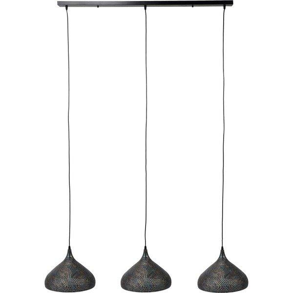 Cette lampe suspendue à 3 lumières est en métal et a une couleur noir / marron. Les stores en forme d'entonnoir sont pourvus de trous de perforation à travers lesquels la lumière brille magnifiquement. Le plafonnier a la même couleur noir / marron que les écrans.