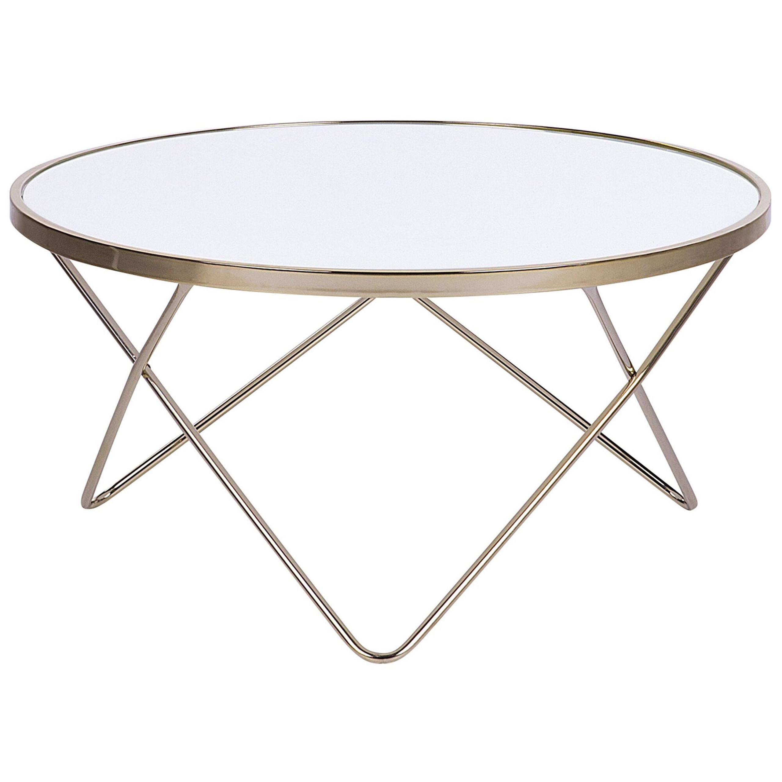 Table basse avec plateau en verre blanc et pieds en métal. Cette table basse apportera un design art déco et une touche de modernité à votre intérieur. La petite table ronde présente des pieds en épingle dorés et un plateau de table en verre trempé blanc qui donne au design un look glamour et élégant.