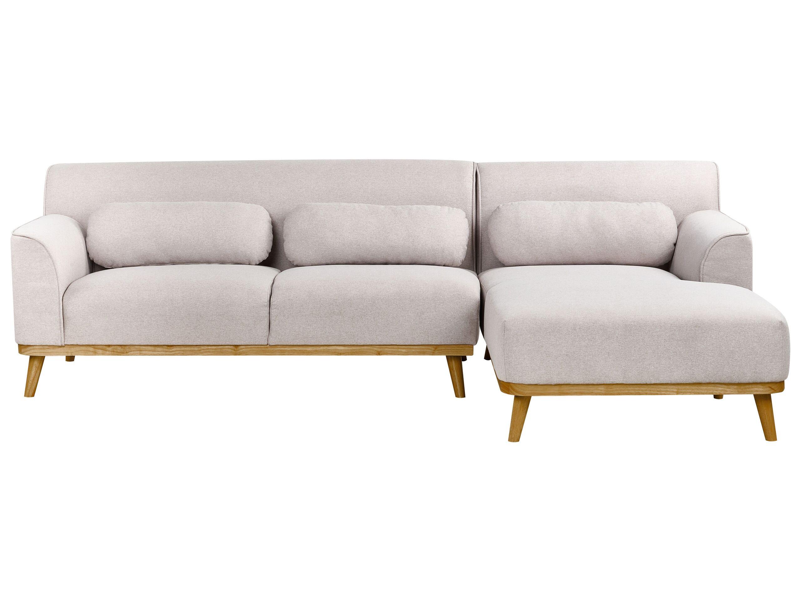Canapé moderne en L. Faites-vous plaisir avec ce canapé d'angle 3 places. Enveloppé dans l'étreinte luxuriante du revêtement en tissu, vous remarquerez qu'il est extrêmement agréable au toucher. La base et les pieds décoratifs en bois ajoutent une touche de charme et s'intègrent parfaitement à tout intérieur. Généreusement agrémenté de coussins, ce canapé est une invitation à se détendre avec style.