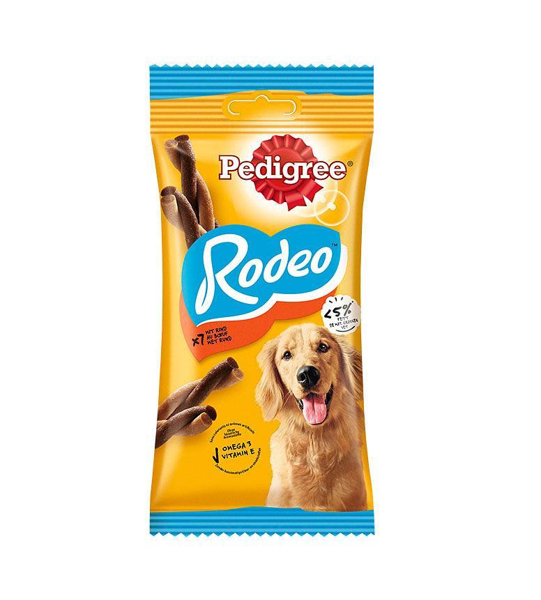 Pedigree Rodeo Pedigree Rodeo est un délicieux snack qui, grâce à sa forme spéciale tressée et à sa texture spéciale à mâcher, constitue le plaisir à mâcher idéal pour votre chéri. Associée à la délicieuse saveur de viande, ce snack est irrésistible pour votre chéri.