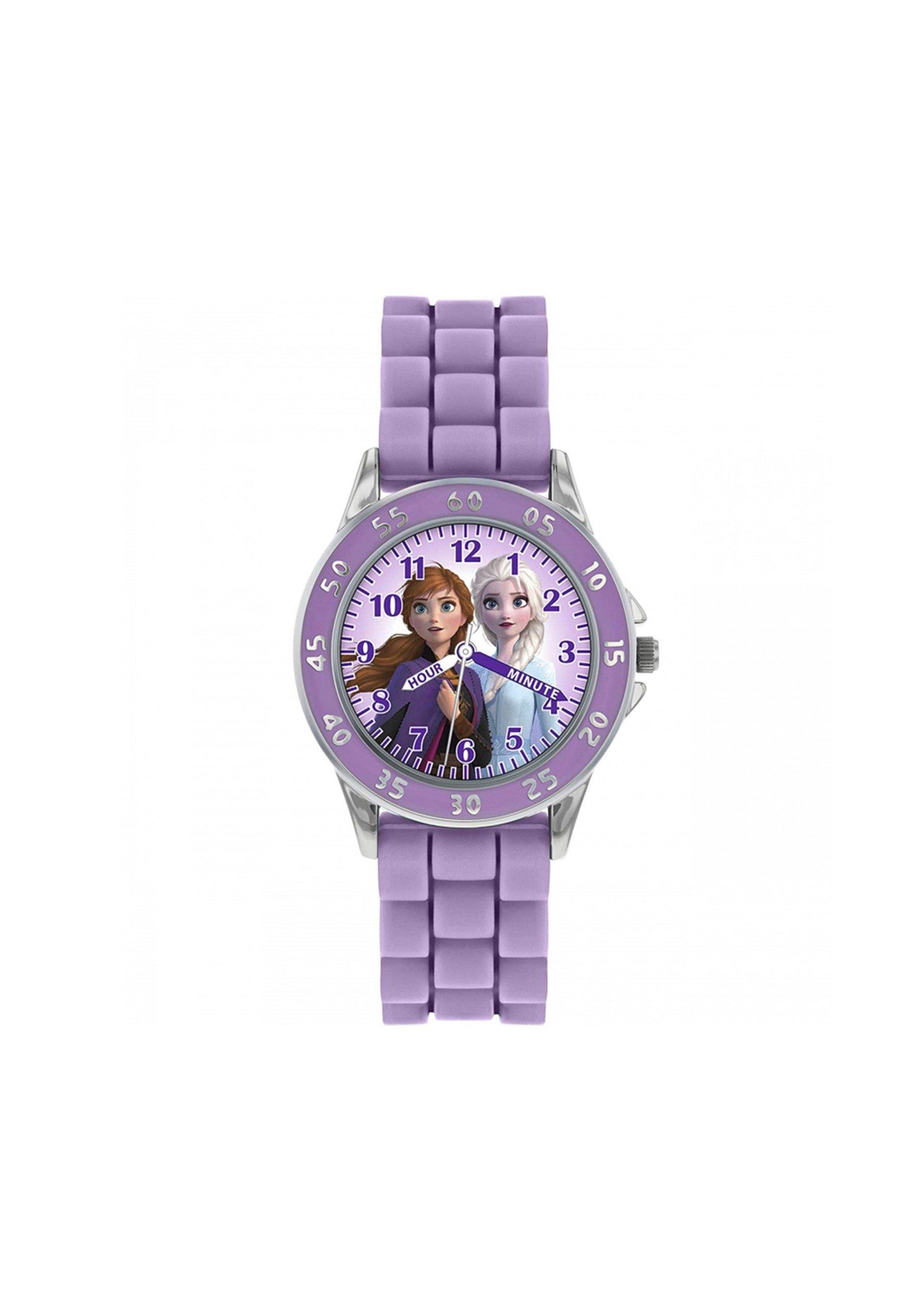 Montre pour enfants Disney Frozen. Montre avec mouvement à quartz. Le boîtier de la montre est en acier, diamètre 33 mm. Le bracelet de montre est fabriqué en silicone dans la couleur violette. Le cadran est imprimé avec Elsa et Anna de Frozen.