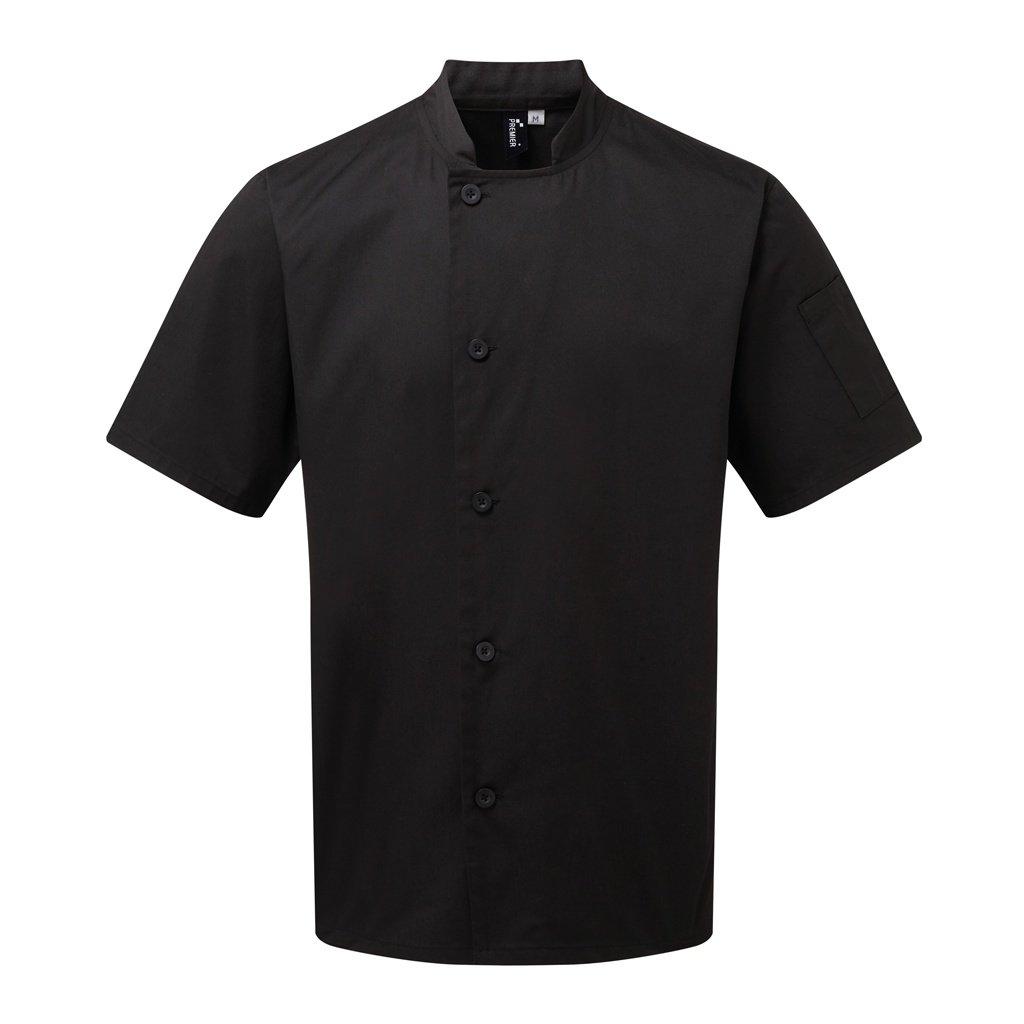 Design/motif: Uni. Caractéristiques: Patte de boutonnage 5 boutons, Facile à entretenir, Boutons en résine. Encolure: Col mandarin. Type de poches: Poche pour stylo, Manche. Type de manches: Manches courtes. g/m²: 170. Fermeture: À bouton. Durabilité: Certifié Oeko-Tex® Standard 100, REACH, Certifié WRAP (production éthique et responsable). Composition: 65% Polyester, 35% Coton. 5XL: 157,5 cm.
