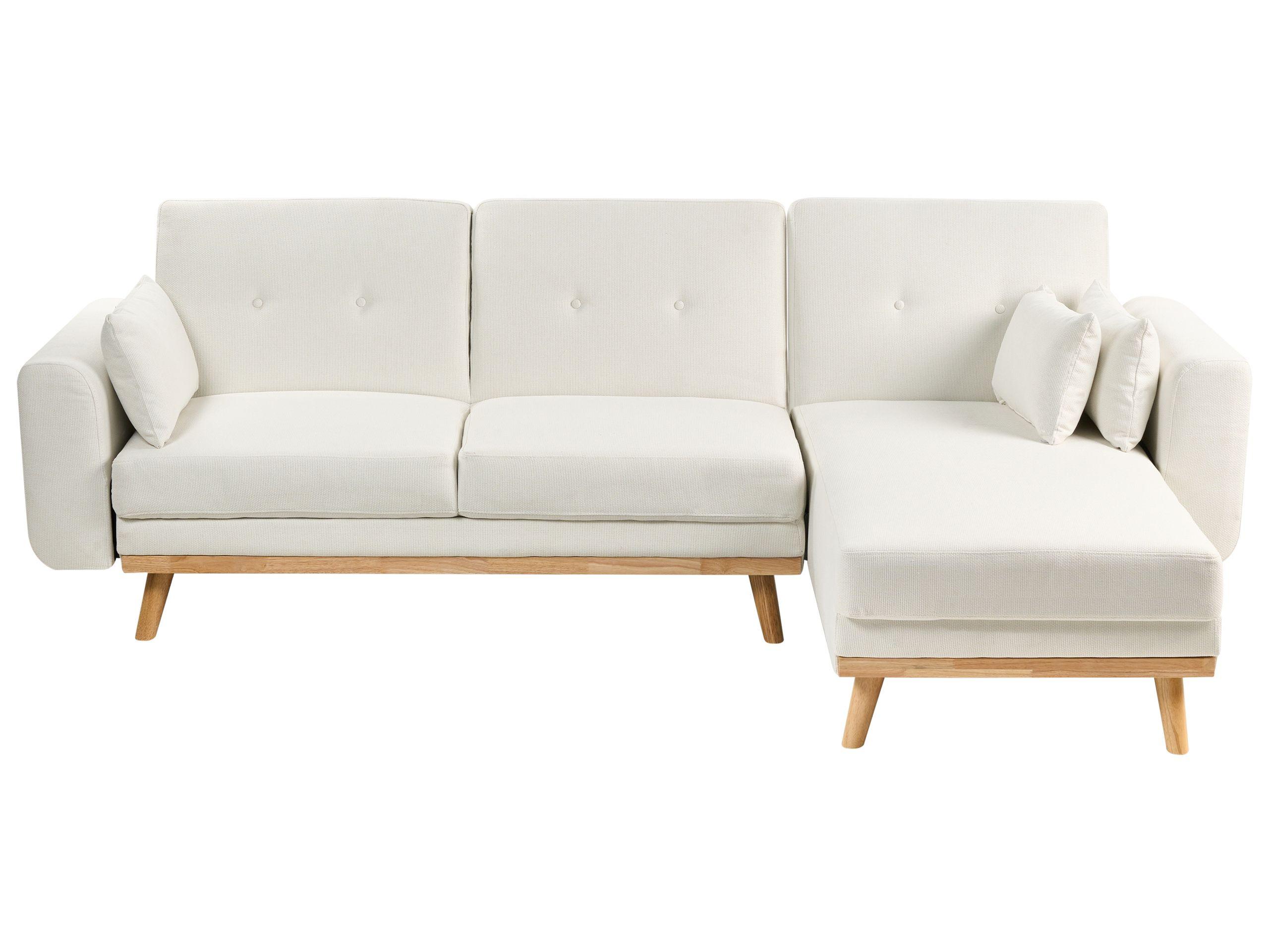 Canapé en L avec coussins. Conçu pour allier style et confort, ce canapé d'angle offre une surface d'assise spacieuse, idéale pour se détendre ou recevoir des invités. Le revêtement en tissu est à la fois doux et résistant, et les pieds en bois d'hévéa ajoutent une touche de chaleur au design moderne. En outre, il est doté d'une fonction de couchage, qui vous permet de transformer facilement le canapé en un lit confortable. Une pièce polyvalente qui s'intègre sans effort dans les maisons contemporaines.