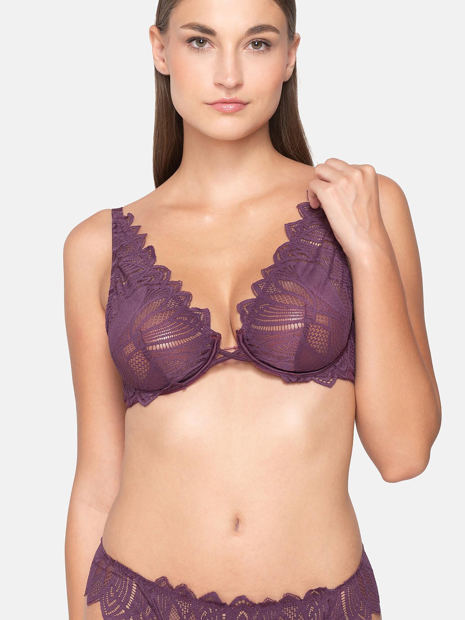 Le soutien-gorge triangle armaturé de la collection SYLVIE présente une dentelle délicate avec des bonnets triangulaires armaturés non préformés et une fermeture fine classique dans le dos. Il met en valeur le décolleté grâce à sa superbe dentelle festonnée. Le maintien est confortable et l'ajustement est parfait grâce aux bretelles réglables. La dentelle utilisée pour la collection SYLVIE s'inspire de la forme des premières feuilles d'automne, reflétant la beauté trouvée dans la nature.