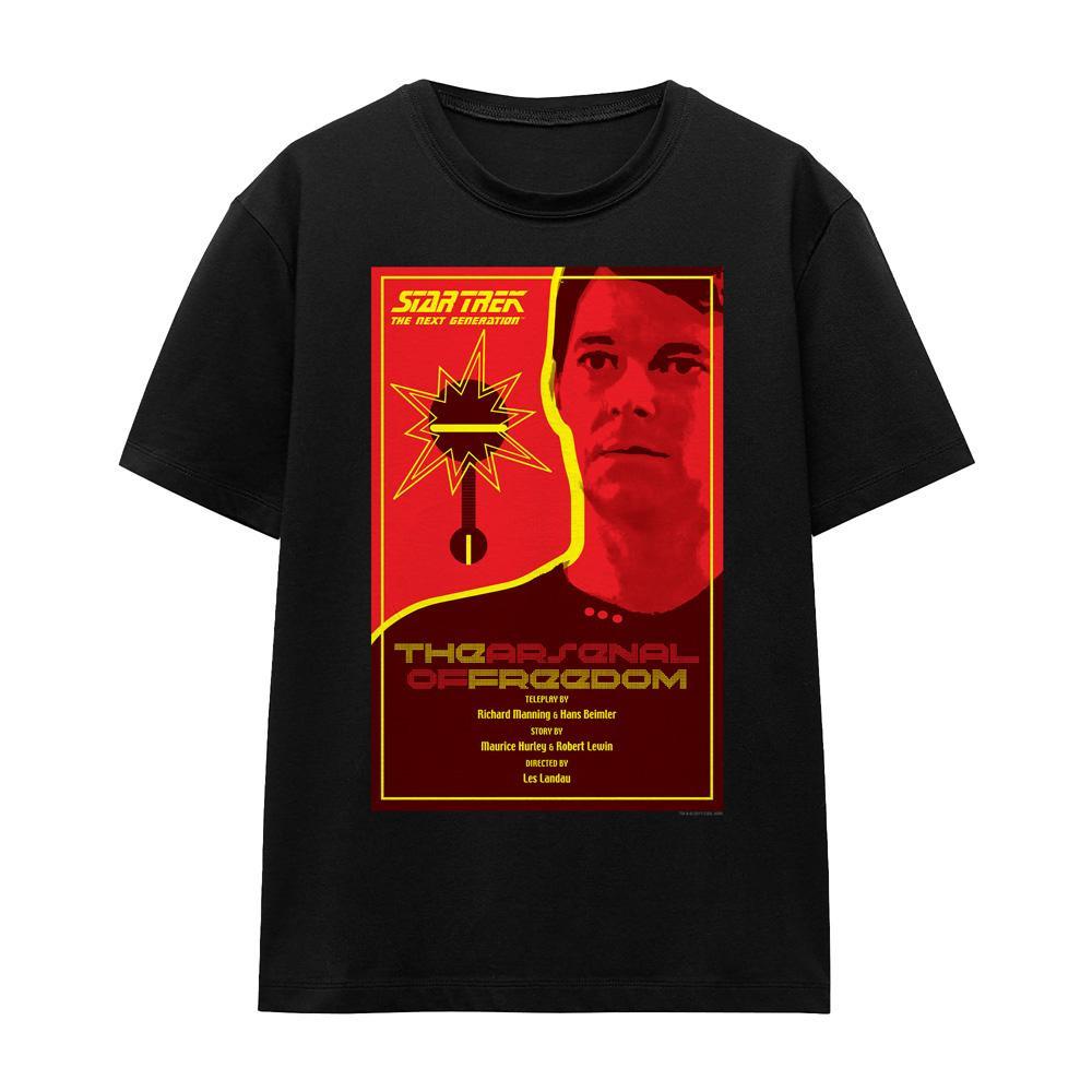 Ce T-shirt présente un imprimé graphique inspiré de Star Trek: The Next Generation Saison 1 Épisode 21, « L'Arsenal de la liberté ». Le design capture l'essence de l'épisode avec une esthétique audacieuse et rétro-futuriste.