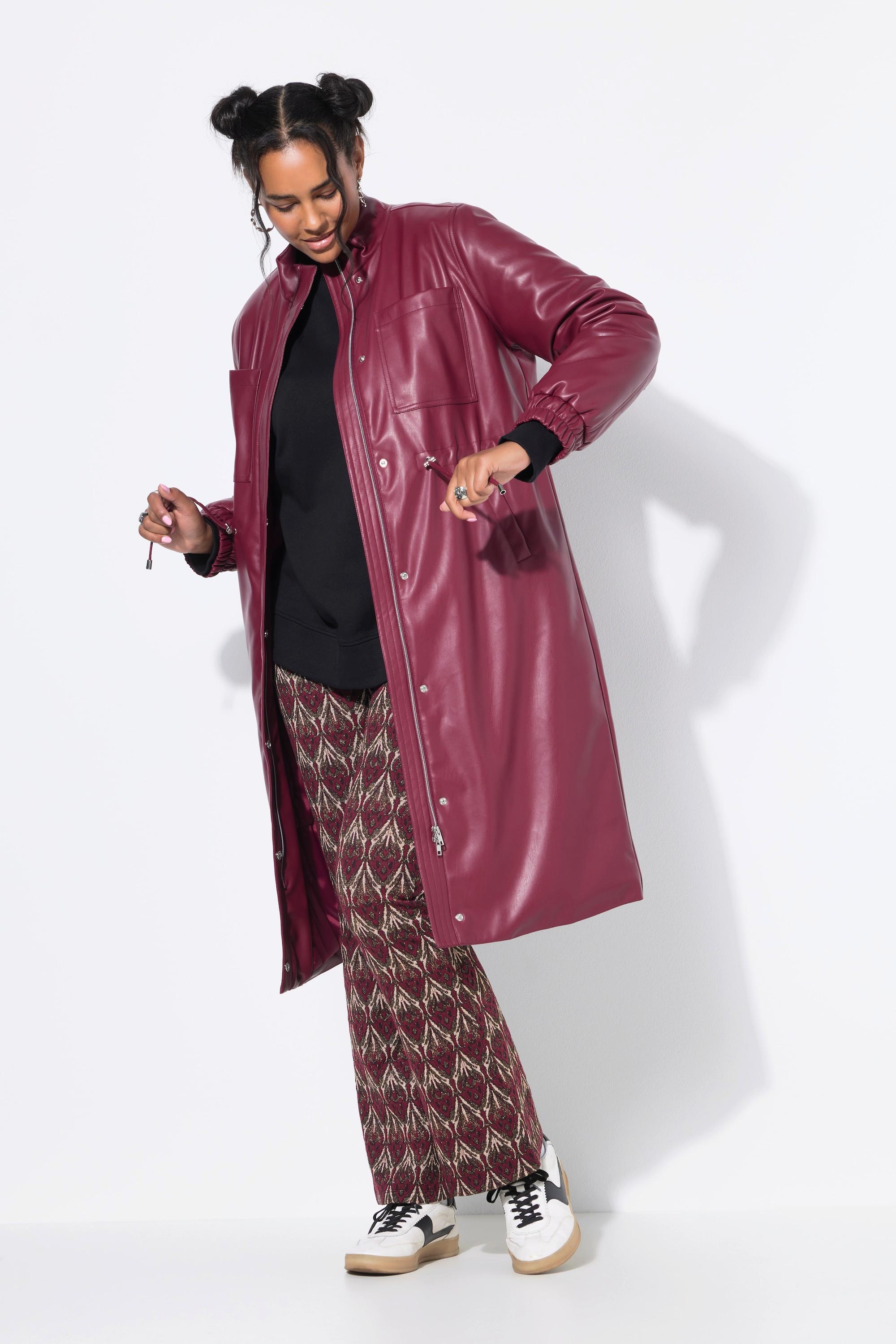 Ce manteau présente un aspect cuir élégant, offrant une esthétique moderne et audacieuse. Il est conçu avec un cordon de serrage pratique à la taille, permettant un ajustement réglable et une silhouette flatteuse. Le manteau allie mode et fonctionnalité, ce qui en fait un ajout polyvalent à toute garde-robe.