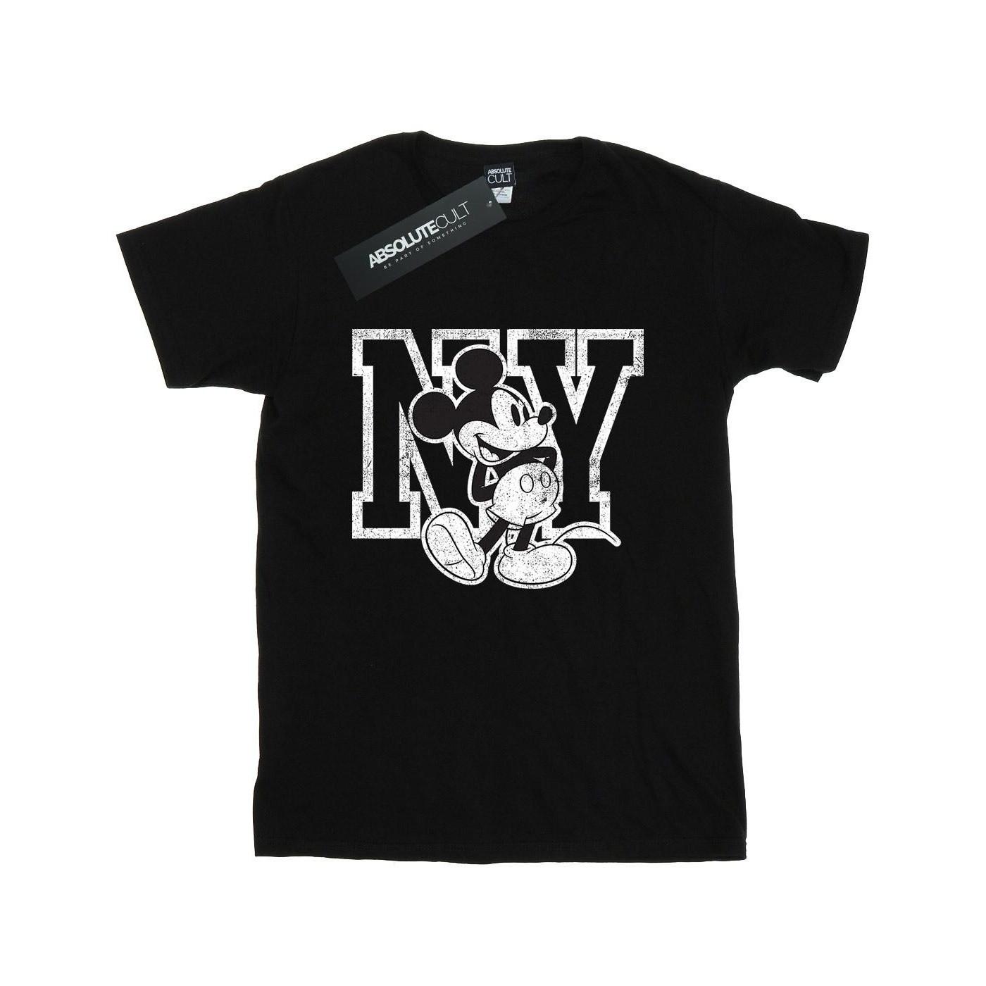 Ce T-shirt présente un col ras-du-cou classique et des manches courtes, offrant une coupe confortable et polyvalente. Le design met en valeur un graphique 'NY' vieilli avec Mickey Mouse intégré dans la lettre 'Y', ajoutant une touche ludique et emblématique au vêtement.