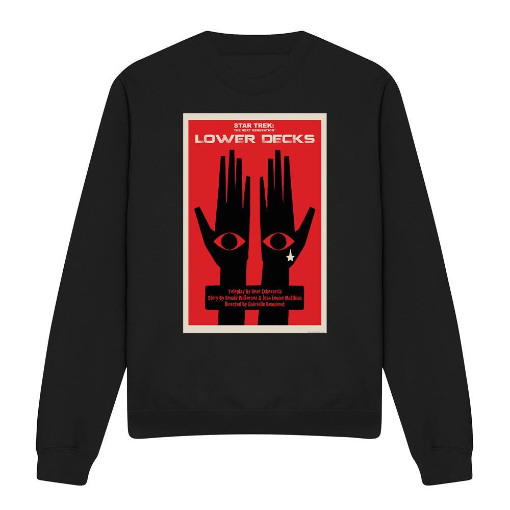 Ce sweatshirt présente un imprimé graphique unique inspiré de « Star Trek : The Next Generation » et « Lower Decks ». Le design met en scène deux mains avec des yeux sur les paumes, sur un fond rouge vif, créant un look distinctif et accrocheur.