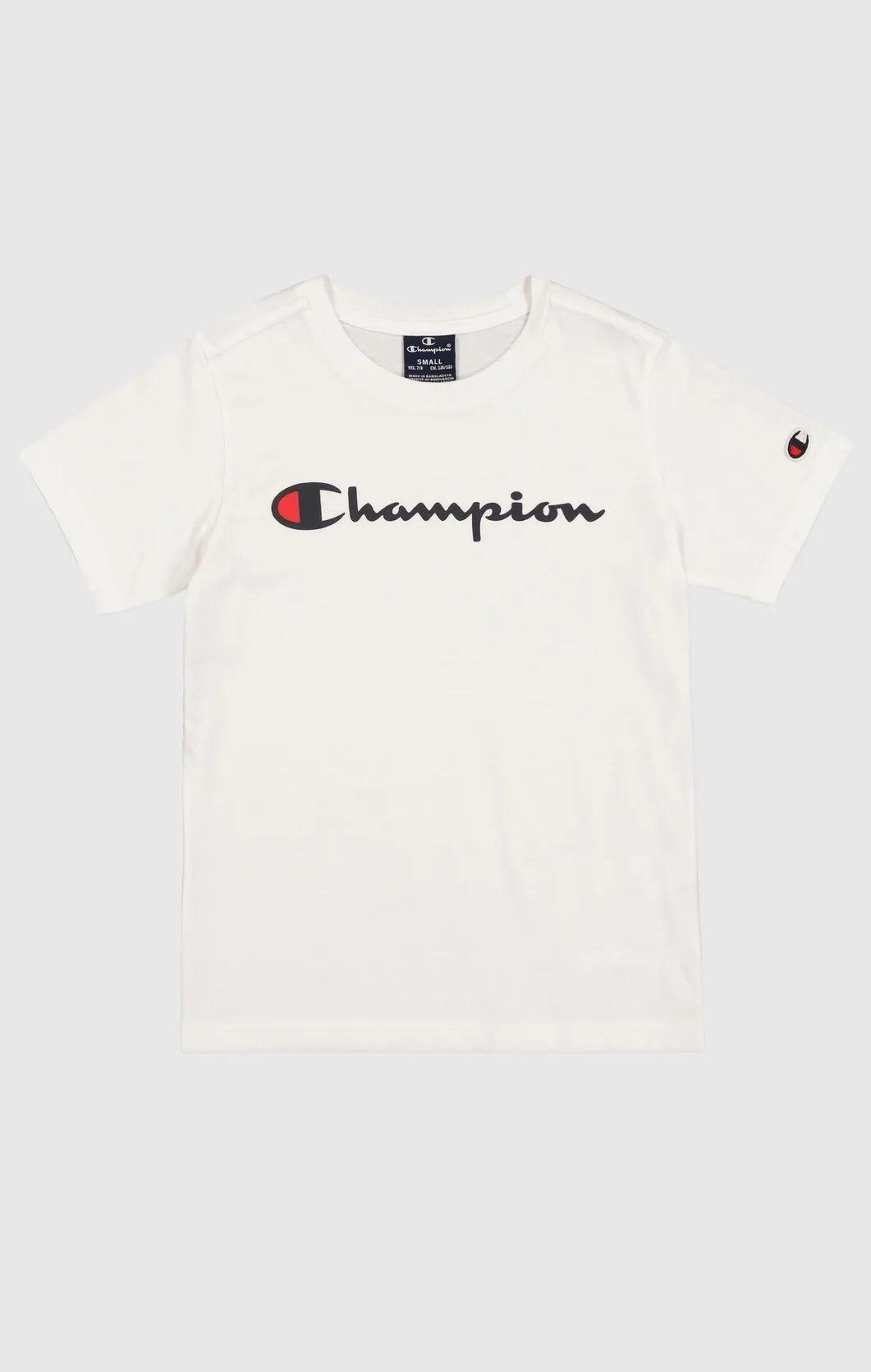 T-shirt K's Crewneck de la marque Champion, confectionné en 100% de coton pour un confort optimal. Ce décontracté et basique t-shirt à manches courtes est parfait pour votre quotidien, vos loisirs ou votre travail. Il offre une respirabilité et un confort exceptionnels, ce qui en fait un choix polyvalent. La couleur blanc est simple et élégante, et le style de la t-shirt est classique avec un col en V. Le logo Champion est bien visible sur la poitrine, entouré d'un emblème rouge et noir. Un petit logo Champion est également présent sur la manche droite. La taille est indiquée sur une étiquette à l'intérieur du col.