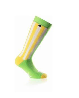 Ces chaussettes de sport offrent un confort optimal et une couleur vive, les rendant adaptées à diverses activités. Le design présente un motif rayé ludique et accrocheur en vert lime, jaune et blanc, s'étendant de la pointe au revers pour un look cohérent et élégant.