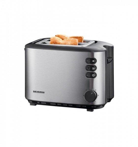 AT 2514 Grille-pain automatique de SeverinAttrayante et fonctionnelle : grillage, décongélation et chauffage.Avec les 850 watts de l'AT 2514, les tranches de pain grillé peuvent être grillées de manière optimale et les petits pains peuvent être réchauffés de manière pratique. Il suffit de placer les produits de boulangerie dans le grille-pain ou sur l'accessoire intégré pour petits pains et le tour est joué.L'électronique intégrée du temps de grillage avec capteur de température veille à ce que rien ne devienne trop noir.En outre, un niveau de dégivrage et un niveau de réchauffage sans brunissement supplémentaire peuvent être sélectionnés sur l'appareil. Les lampes de contrôle signalent à l'utilisateur la fonction sélectionnée. Boîtier en acier inoxydable de haute qualité et dispositif de grillage des petits pains intégré.Centrage de la tranche de pain pour un brunissement uniforme des deux côtés du pain.Niveau de réchauffage, niveau de dégivrage et bouton de déclenchement avec témoin lumineux.