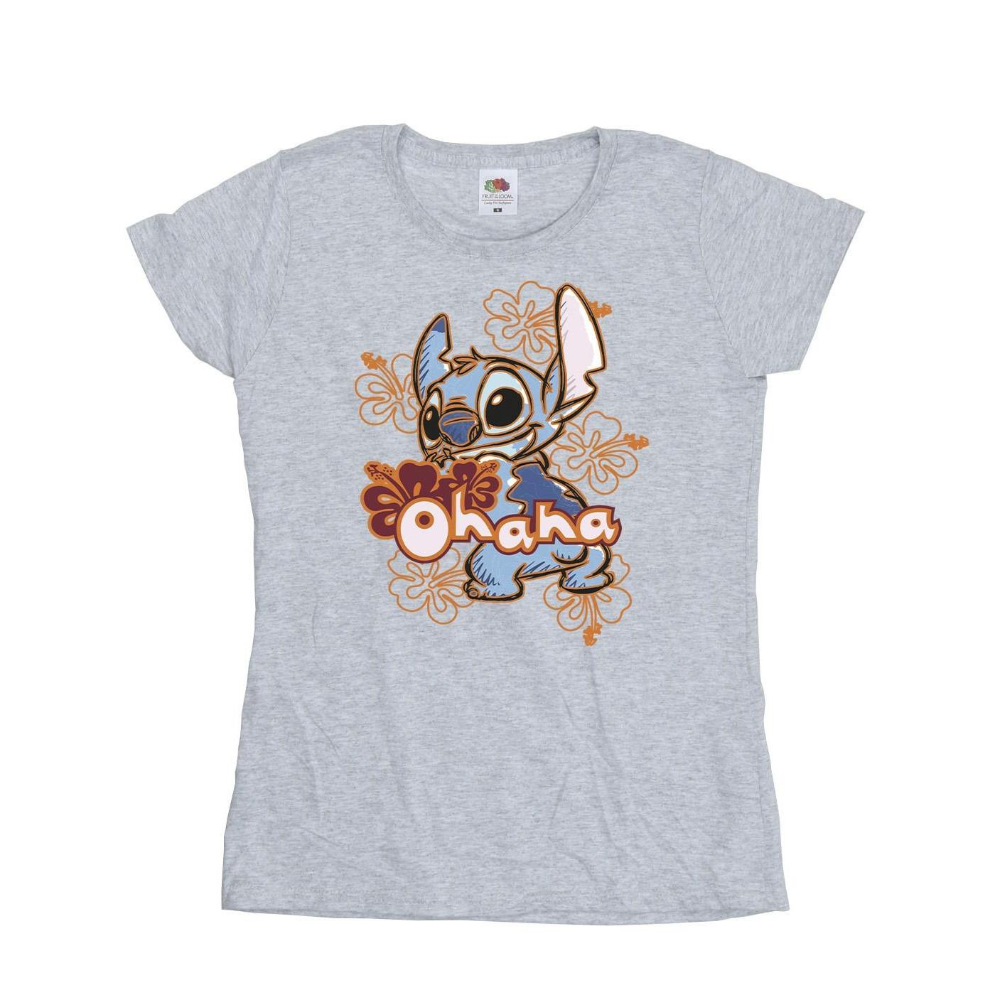 Ce T-shirt présente un imprimé graphique ludique de Stitch de Disney, entouré d'accents floraux et du mot « Ohana ». Le col rond classique et les manches courtes en font un ajout polyvalent à toute garde-robe décontractée.