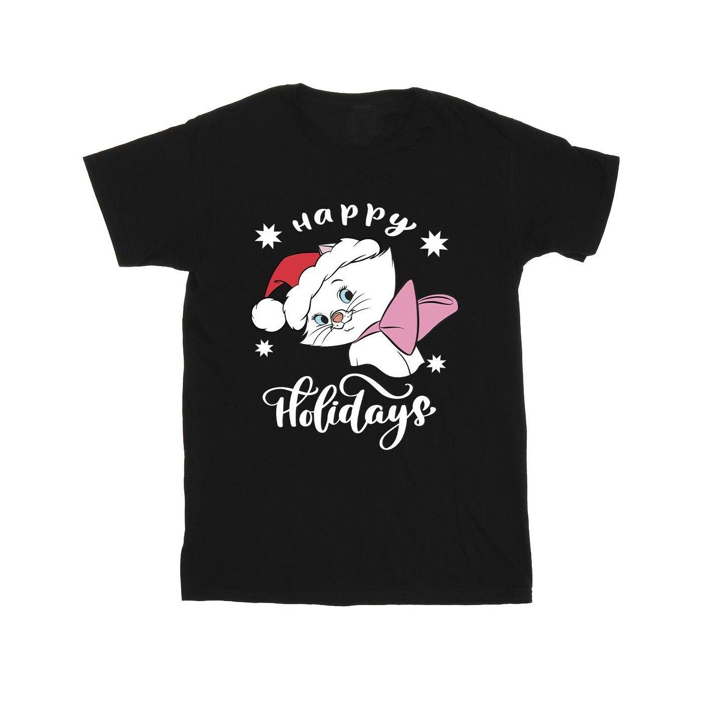 Ce T-shirt présente un graphique festif de Marie des Aristochats de Disney, portant un bonnet de Noël et un nœud rose, accompagné du texte « Happy Holidays ». Le design est imprimé sur un T-shirt classique à manches courtes, ce qui en fait un ajout charmant à toute garde-robe décontractée.