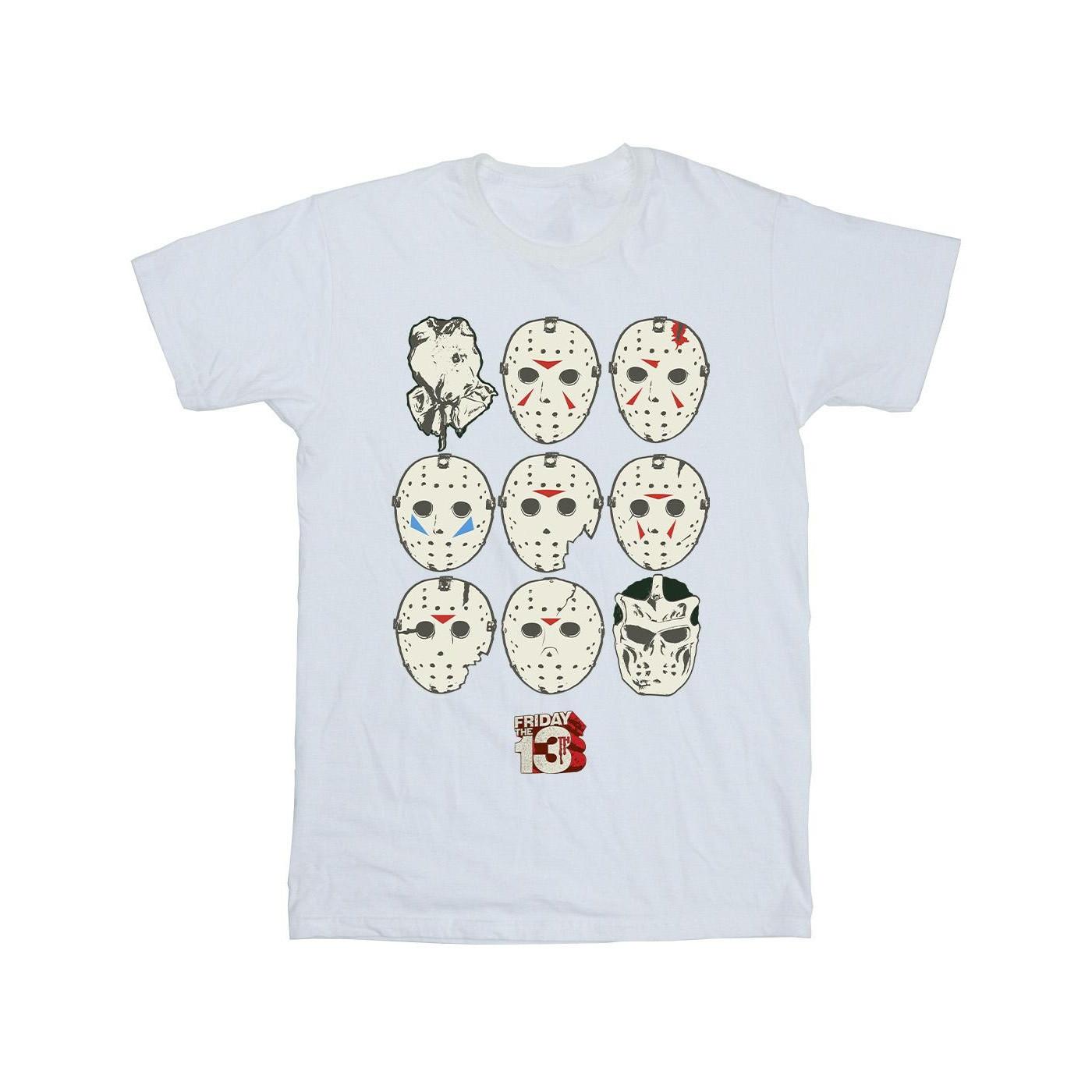 Ce T-shirt présente un imprimé graphique de divers masques de Jason Voorhees de la série de films d'horreur emblématique Friday the 13th. Le design met en valeur l'évolution du masque de Jason tout au long de la franchise, en faisant une pièce distinctive pour les fans.