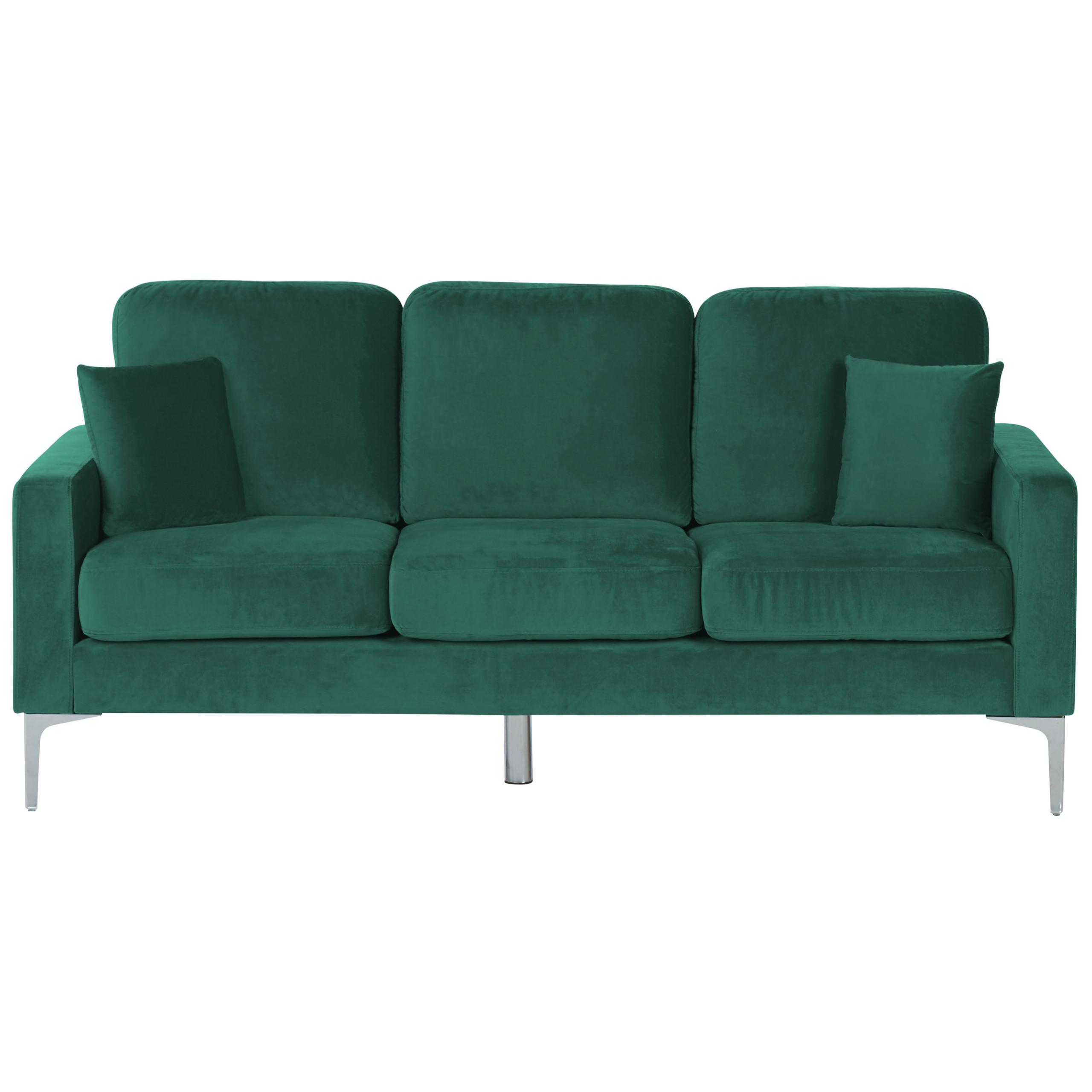 Canapé en velours avec coussins assortis. Un canapé au look classique à trois places qui apporte un accent élégant à tout intérieur. Tapissé d'un luxueux tissu velours doux au toucher, le canapé est doté de coussins d'assise et de dossier généreusement rembourrés qui garantissent un confort d'assise optimal. Les coussins supplémentaires sont recouverts d'une housse amovible pour un nettoyage facile. Le design simple et épuré est mis en valeur par les pieds en métal argenté qui ajoutent une touche vintage à la pièce.