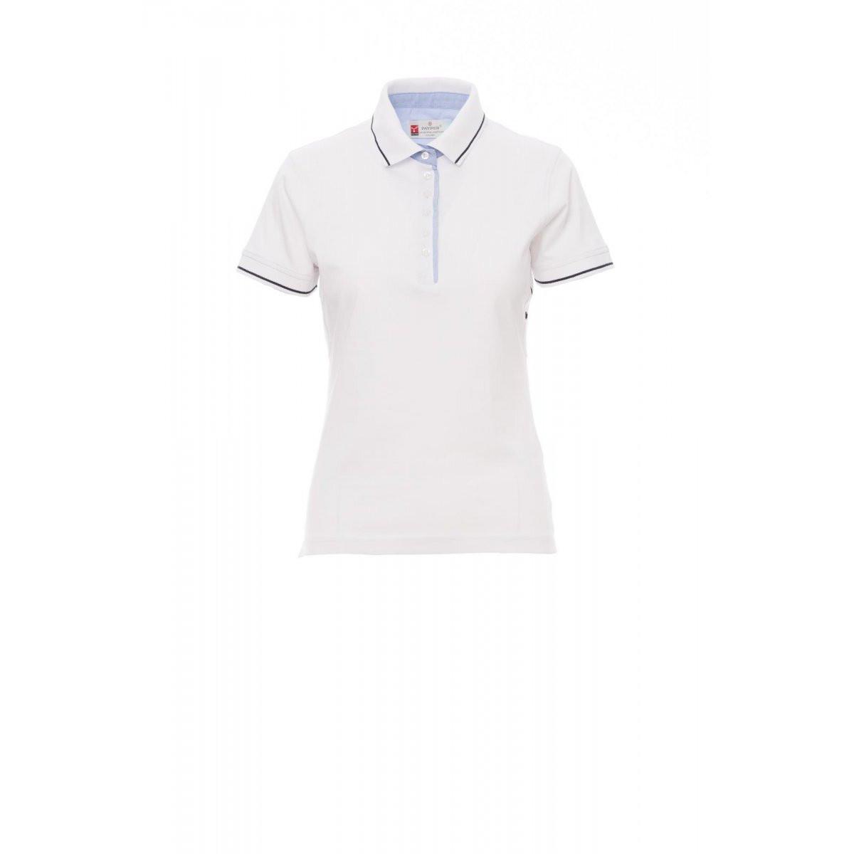 Le polo Payper Leed est un polo cintré pour femme à manches courtes avec six boutons blancs. Il présente un intérieur de col, une patte et des fentes latérales en Oxford bleu ciel. Le col et le bord des manches sont en bord-côte avec un fin profil contrastant. Des œillets sous les bras, des fentes latérales avec couture de renfort, un ruban de renfort latéral, des coutures stretch et un renfort profilé sur l'encolure arrière complètent le design.