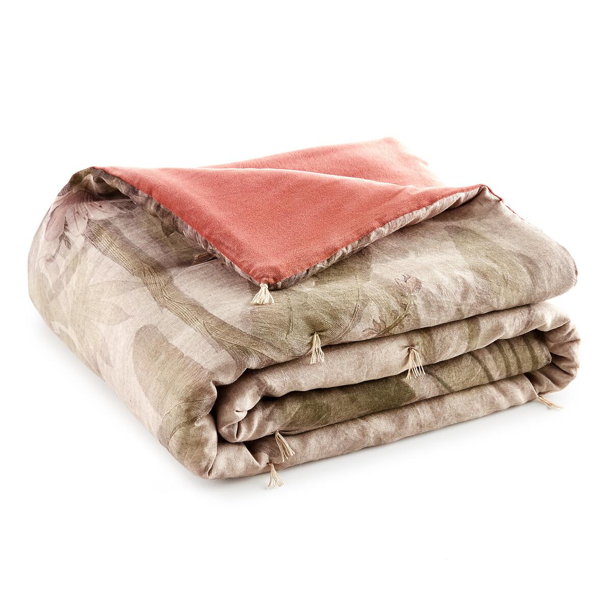 Lexotisme, la fraîcheur et lauthenticité dune forêt de palmiers noyée dans la brume, sur une toile de lin à effet lavé et froissé. Avec ses bouffettes et son dos en velours de coton, le boutis réversible Manali magnifiera un lit ou un canapé.