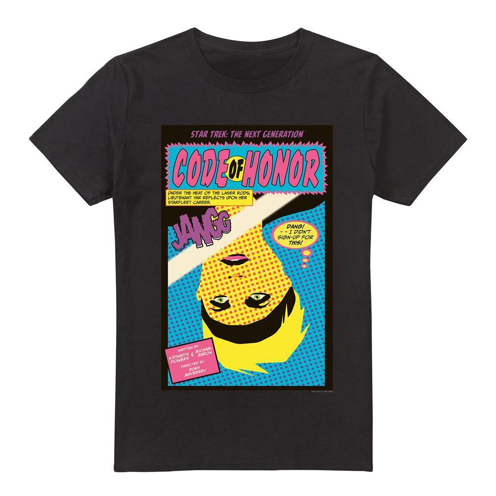 Ce T-shirt présente un imprimé graphique inspiré de "Star Trek: The Next Generation" Saison 1, Épisode 4, intitulé "Code of Honor". Le design capture une esthétique de bande dessinée avec des couleurs vives et des images dynamiques, en faisant une pièce distinctive pour les fans de la série.