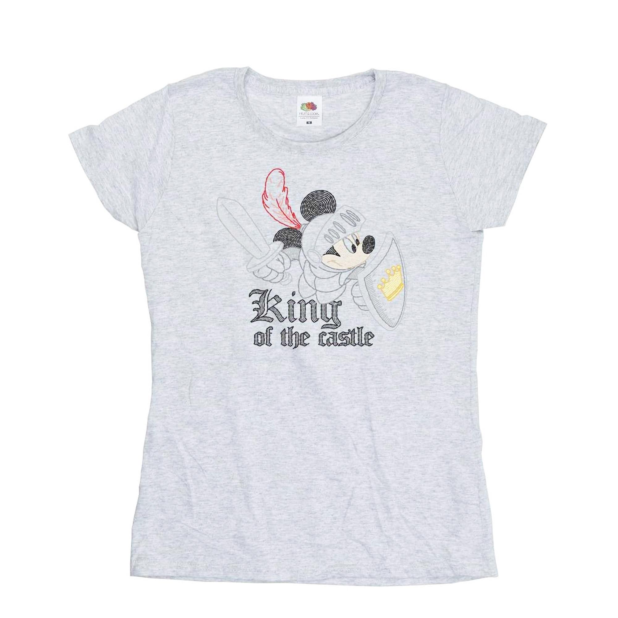 Ce T-shirt présente un imprimé graphique ludique de Mickey Mouse déguisé en chevalier, avec une épée et un bouclier, accompagné du texte « King of the castle ». Le col rond classique et les manches courtes en font un ajout polyvalent à toute garde-robe décontractée.
